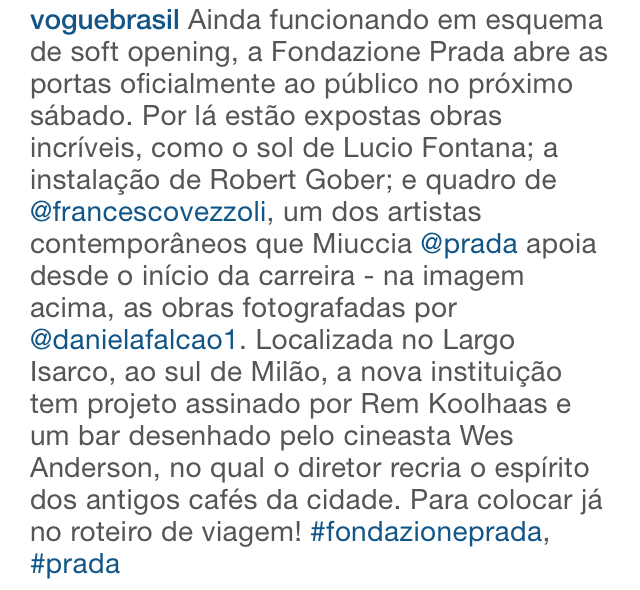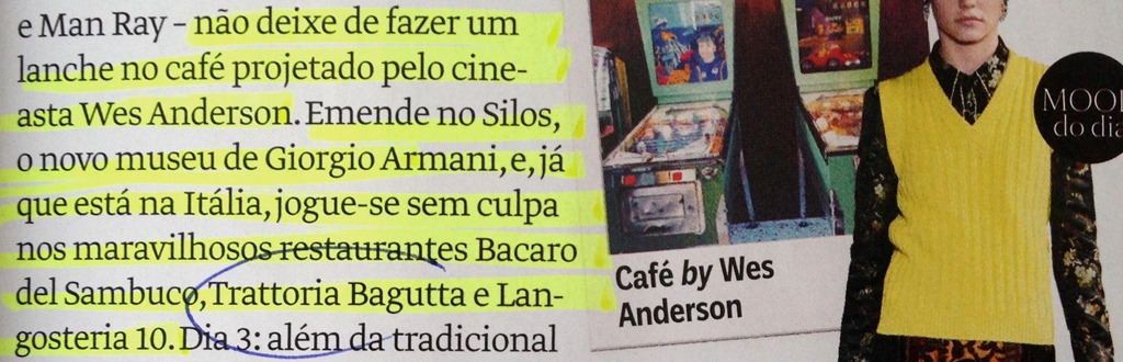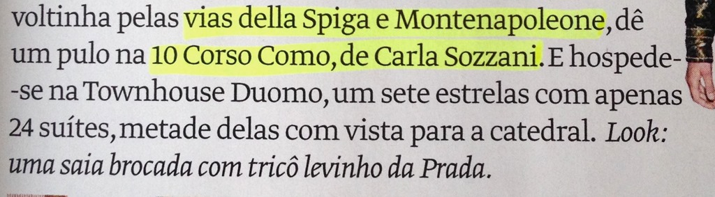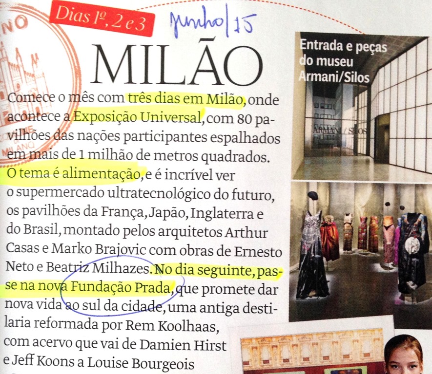Pois é : na VOGUE JUNHO , as melhores dicas de Milão por Bruno Astuto. Eu pulei a EXPO , pois eu só tinha 4 noites nessa minha 1a. vez em Milão. Ou bem eu tirava 2 dias só pra isso e via a EXPO, ou eu conhecia melhor a cidade. Preferi essa opção …
