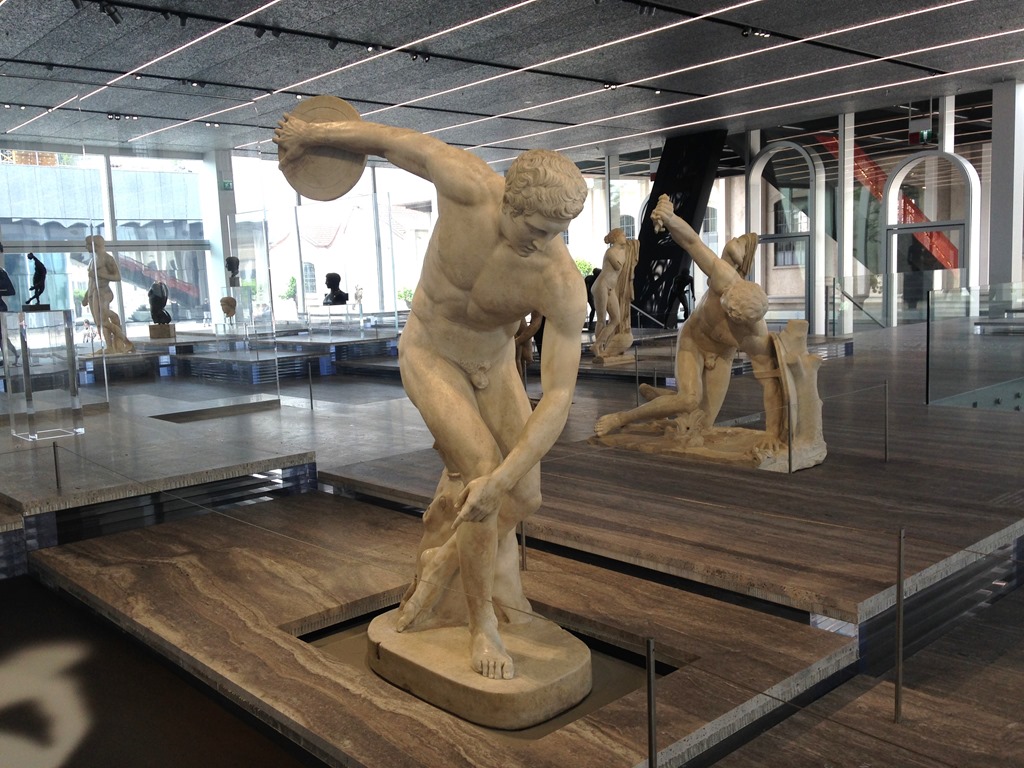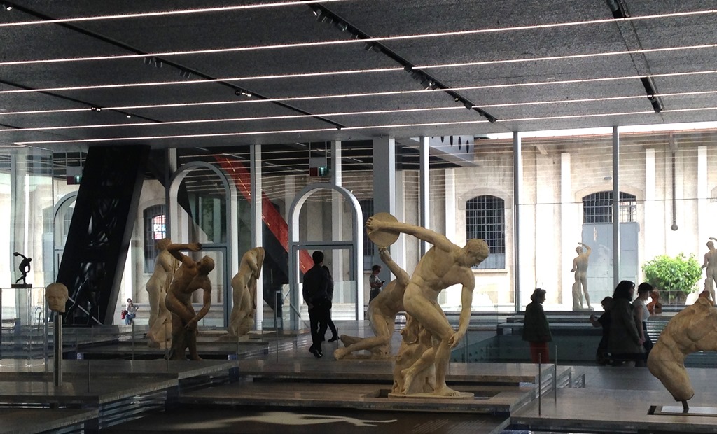 Em Veneza ( foto acima ) , as esculturas clássicas expostas eram réplicas romanas em miniatura das obras de arte genuínas gregas que haviam sido destruídas quase na totalidade. Essa mostra destaca a importãncia de se colecionar e imitar a arte grega na Renascença. Era muito chique ter isso em casa. Já em Milão, a PRADA mostrou algumas poucas estátuas gregas originais em tamanho monumental, e suas várias cópias romanas da época do Império. Várias dessas esculturas gregas antigas em bronze foram “ derretidas “ na Idade Média, pois era sabido que nessa época, o metal valia mais do que a arte. Apenas 2% dos originais sobreviveu. Sorte nossa que os romanos se apaixonaram pela arte grega e copiaram-nas em série ( daí o nome : SERIAL CLASSIC ) , dando-nos a oportunidade de apreciar o que foi a arte grega em sua excelência. Se em Veneza s miniaturas estavam expostas em um Palazzo , em Milão as obras estão em uma estrutura moderna industrial de última geração. E viva os contrastes!
