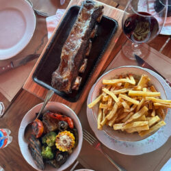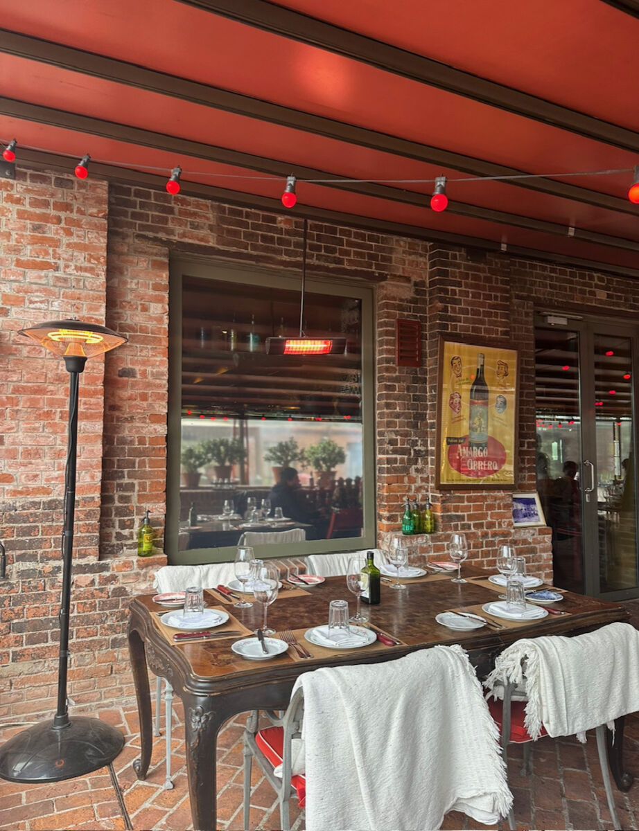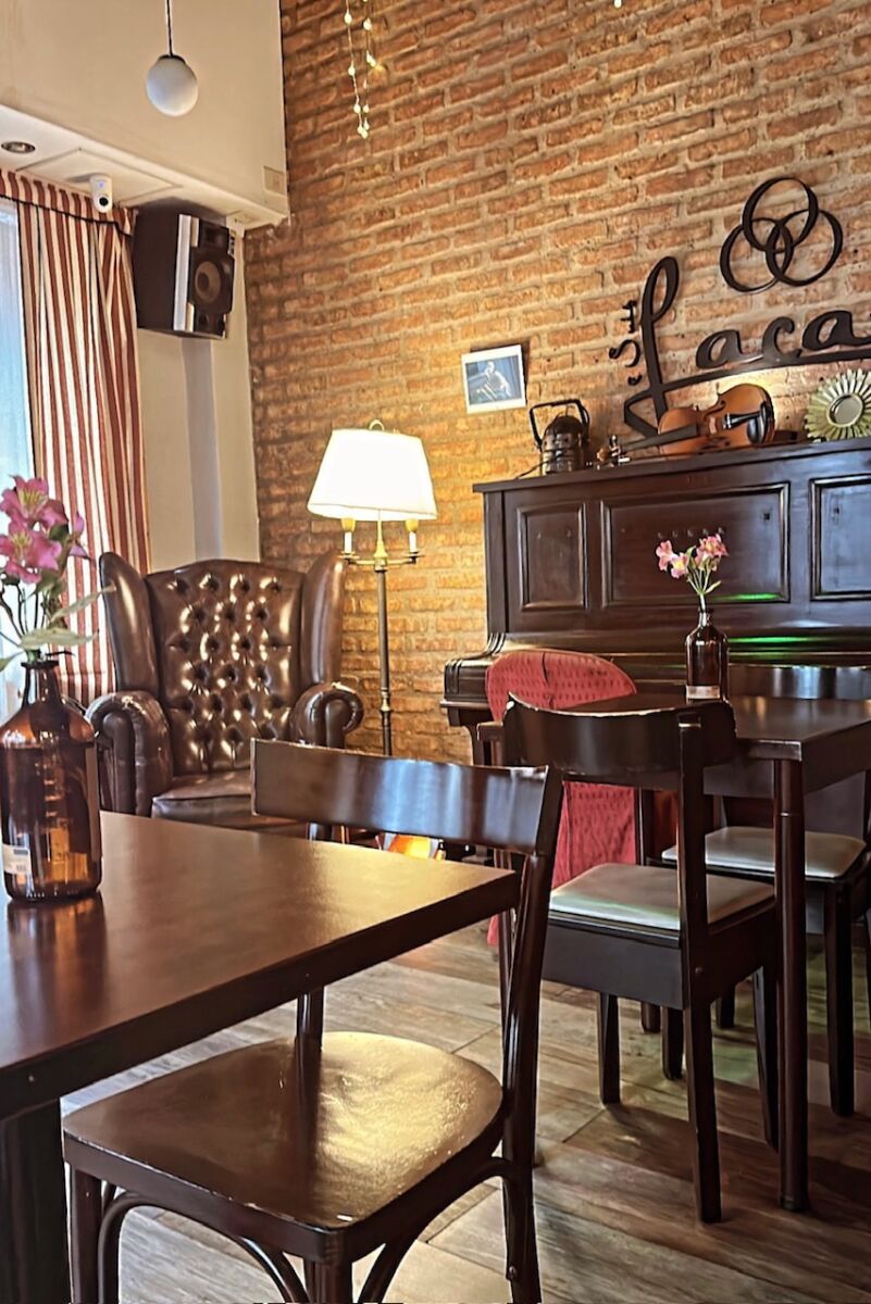 Tanto no ambiente interno quanto no externo , servem a mesma boa comida argentina – parrilla e empanadas inclusive – e é esse o local onde também os hóspedes tomam o café da manhã.