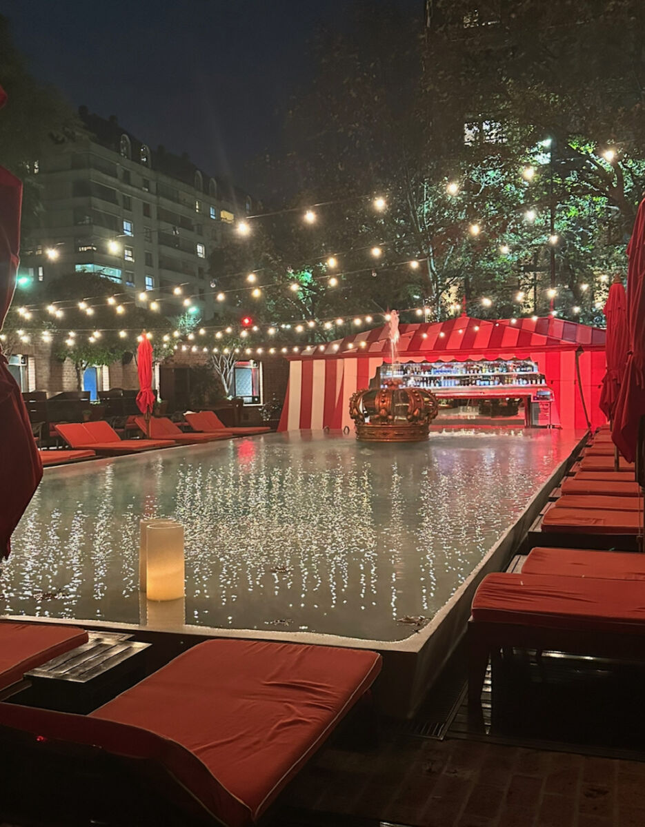 Ele fica ao lado da piscina vermelha maravilhosa …