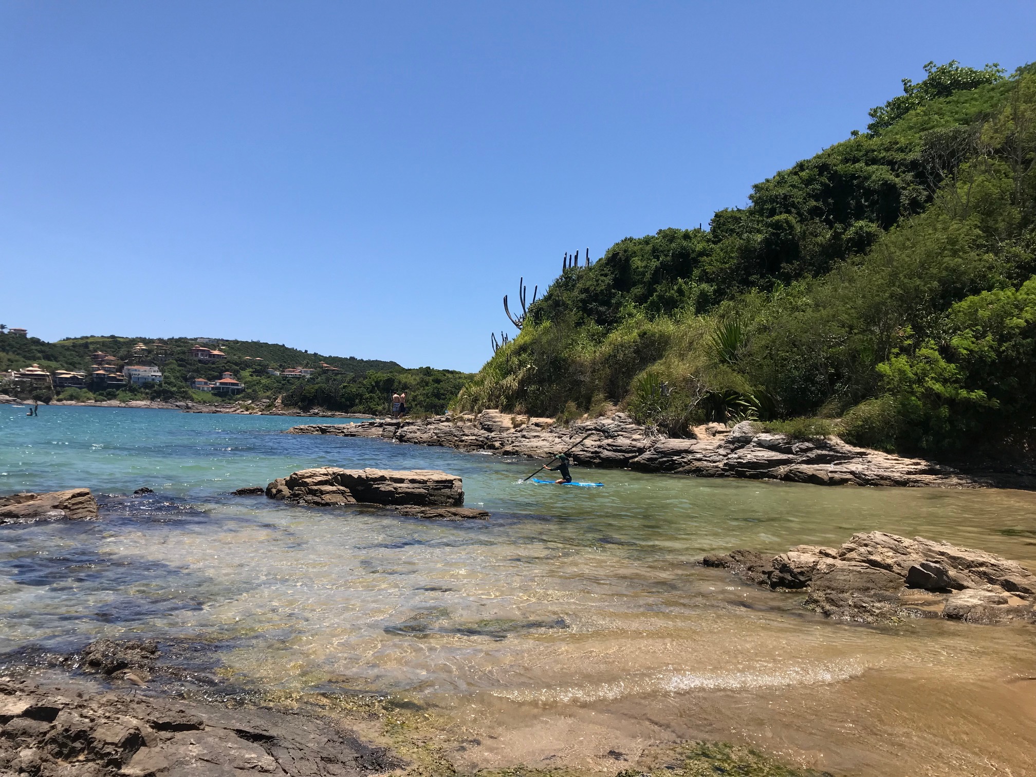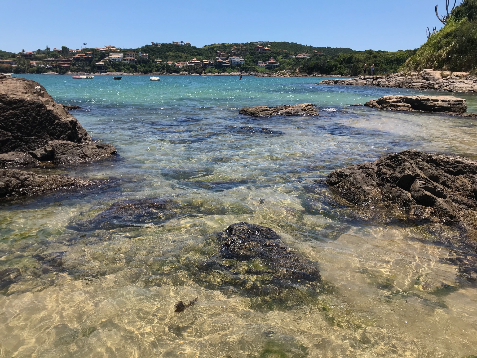 Essa é uma das praias de águas geladas, mas fica sempre lotada mesmo assim. Tem uma extensão maior que outras, tem bares e diversão para crianças. Na ponta direita, esse visual de água transparente e pedras mostra porque Búzios tem a fama de ter tantas praias maravilhosas.