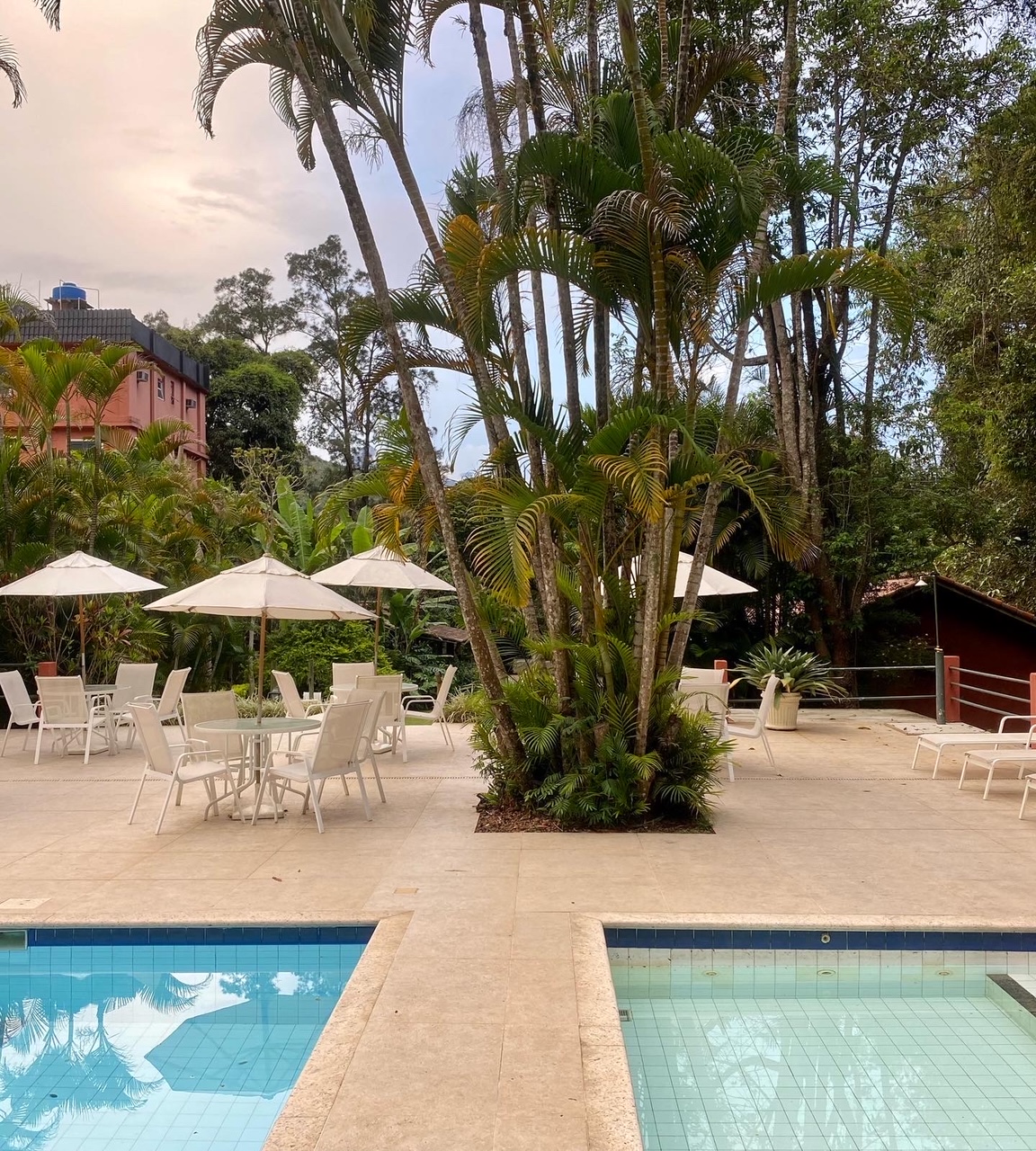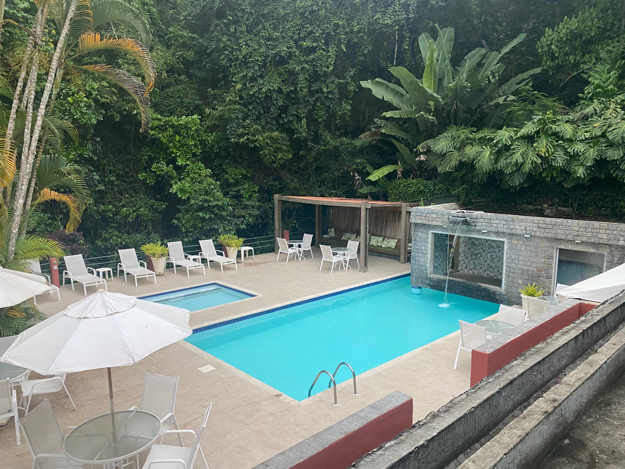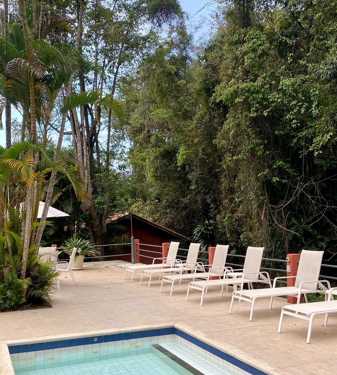 A piscina fica colada na mata e ao lado corre um fiozinho de água que desce da montanha.