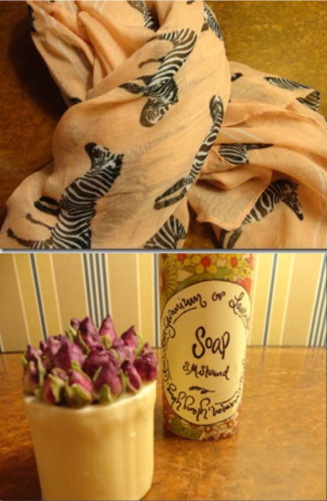 a echarpe rosa de girafas e os sabonetinhos artesanais de flores (um mimo!)