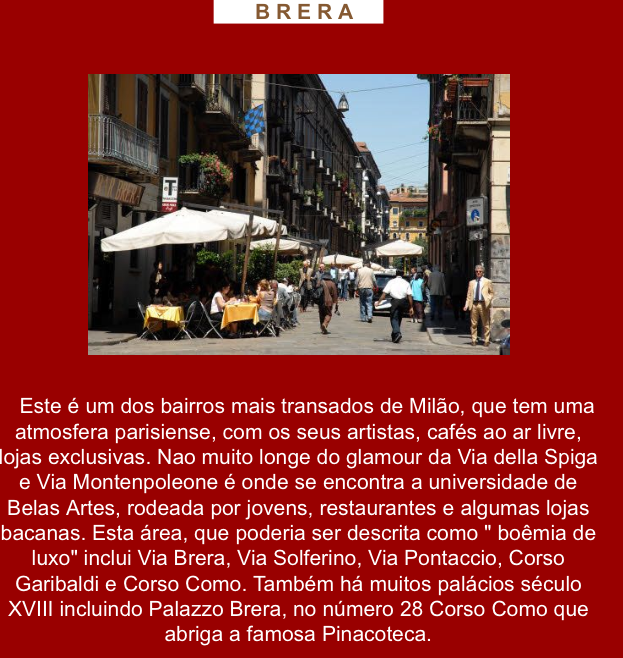 Brera foi no pasado, um bairro de artistas que frequentavam a academia. Hoje é um bairro da noite, mas os decadentes bordéis deram lugar a galerias de arte e lojas descoladas.