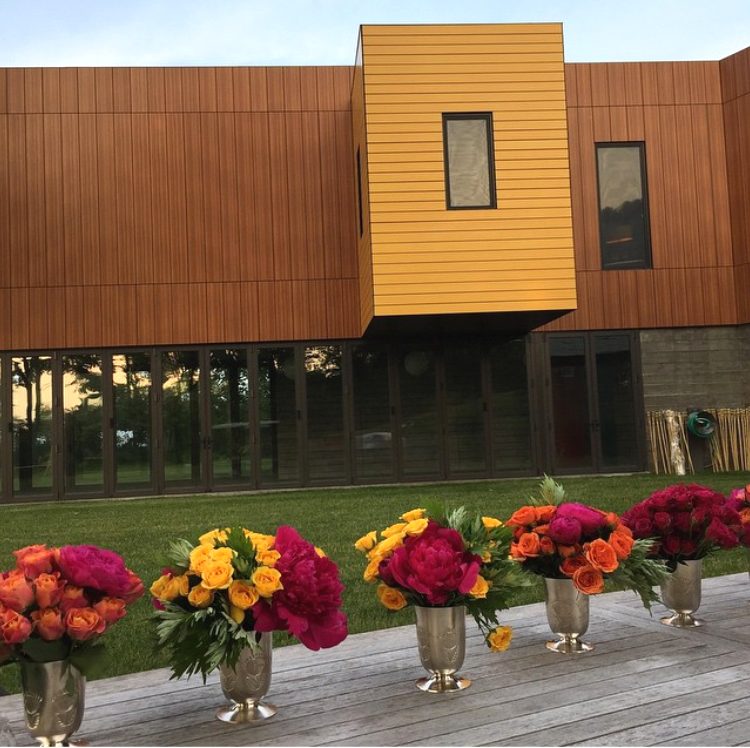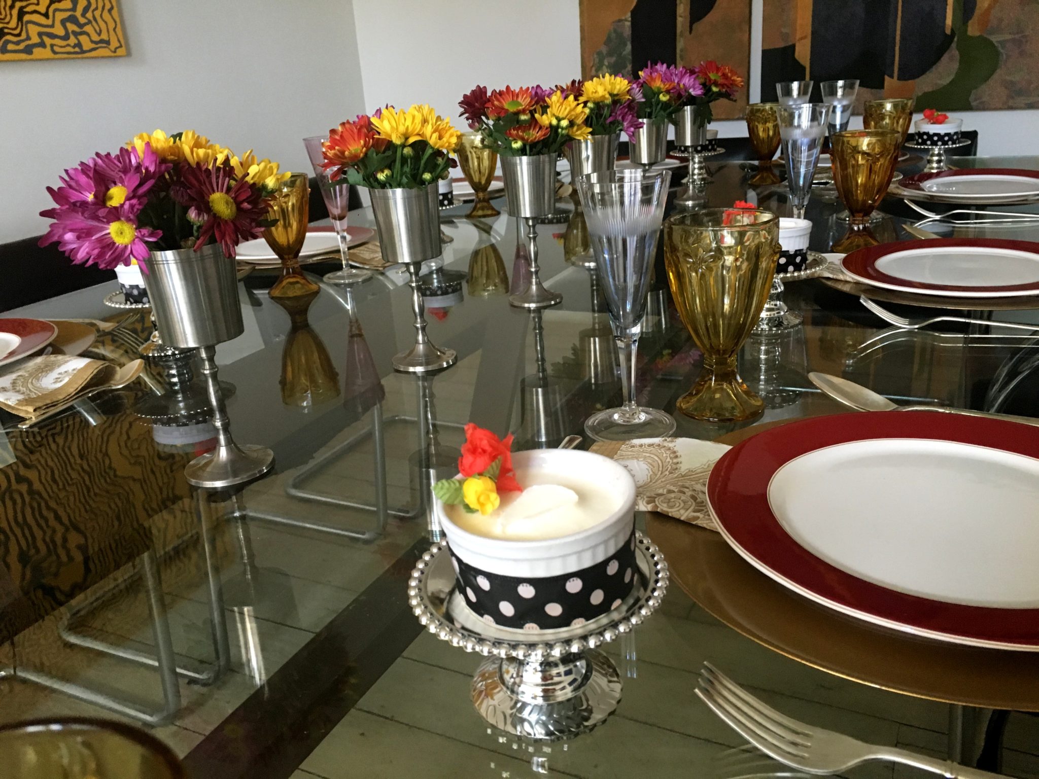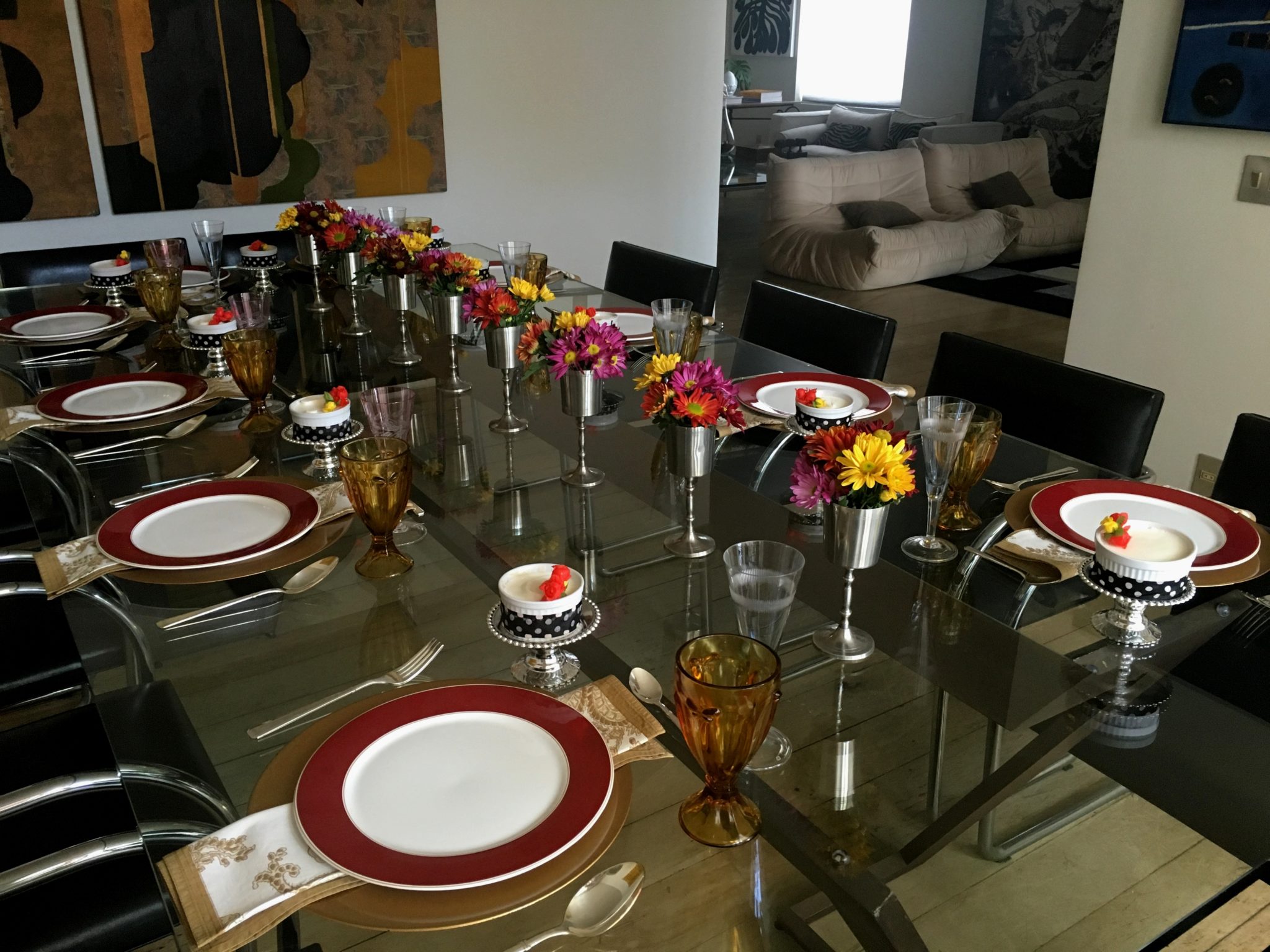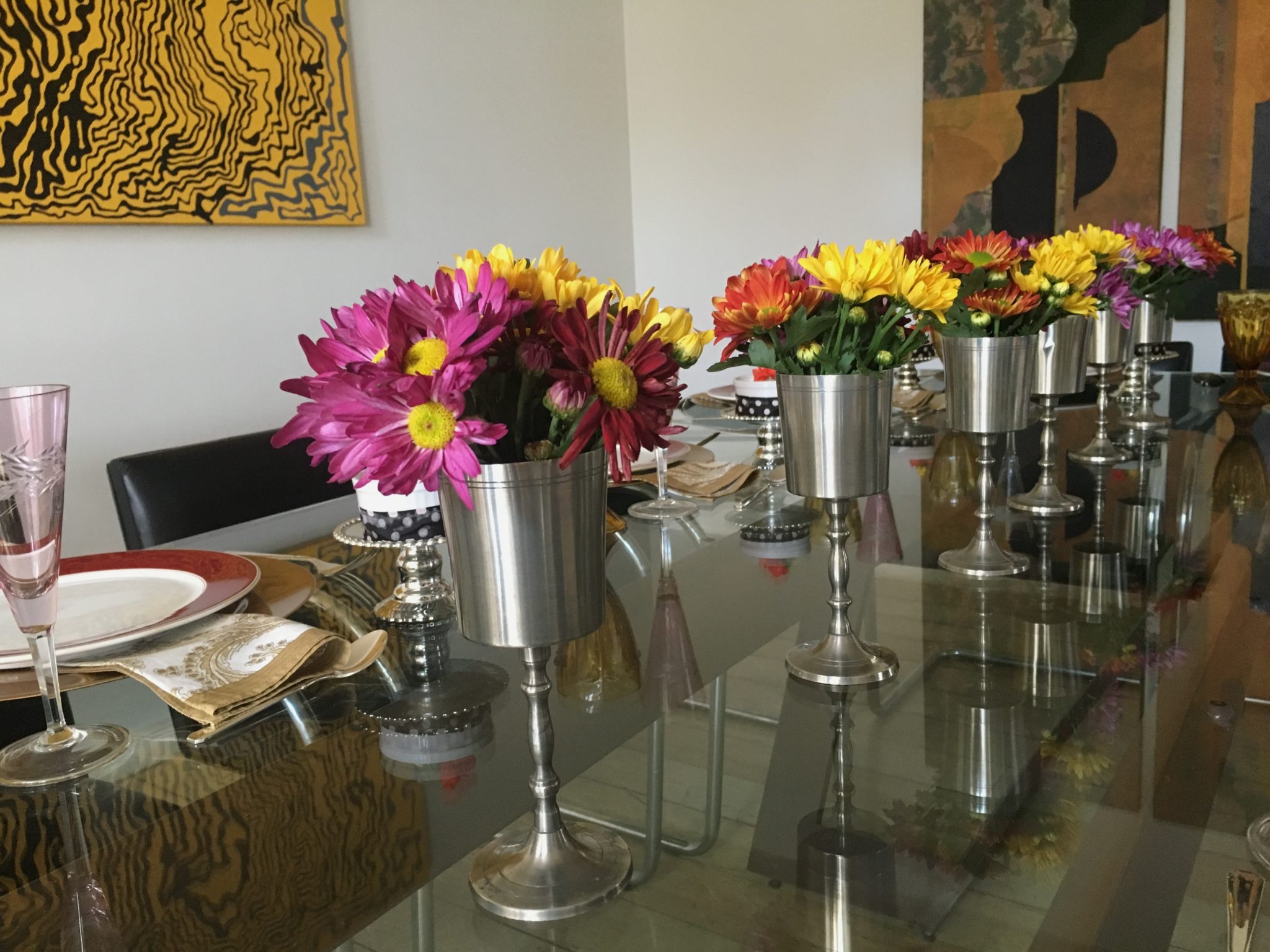Vi essa imagem na internet e amei as cores da casa ( poderiam virar mesa! rsrs ) e os mini-arranjos BEM coloridos montados em taças. Eu tenho taças de estanho de Tiradentes da época do meu casamento. Achei que aquele tom ” desmaiado ” do estanho ficaria lindo em contraste com as cores fortes das flores.