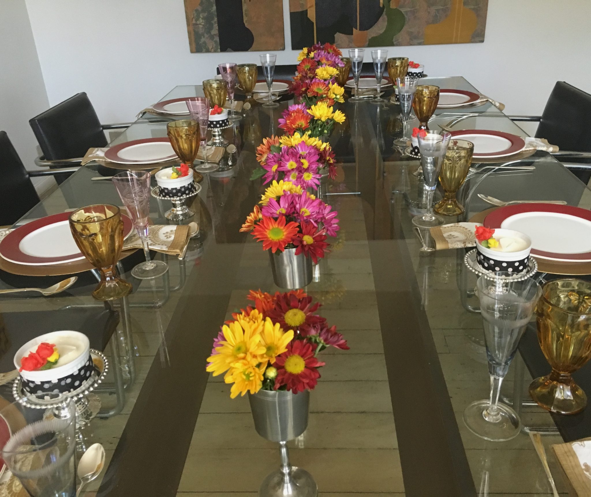Comprei crisântemos no Carrefour em 4 cores diferentes e montei os buquês nas taças mantendo blocos de cor, e não misturando os tons entre si. Aperte o play .