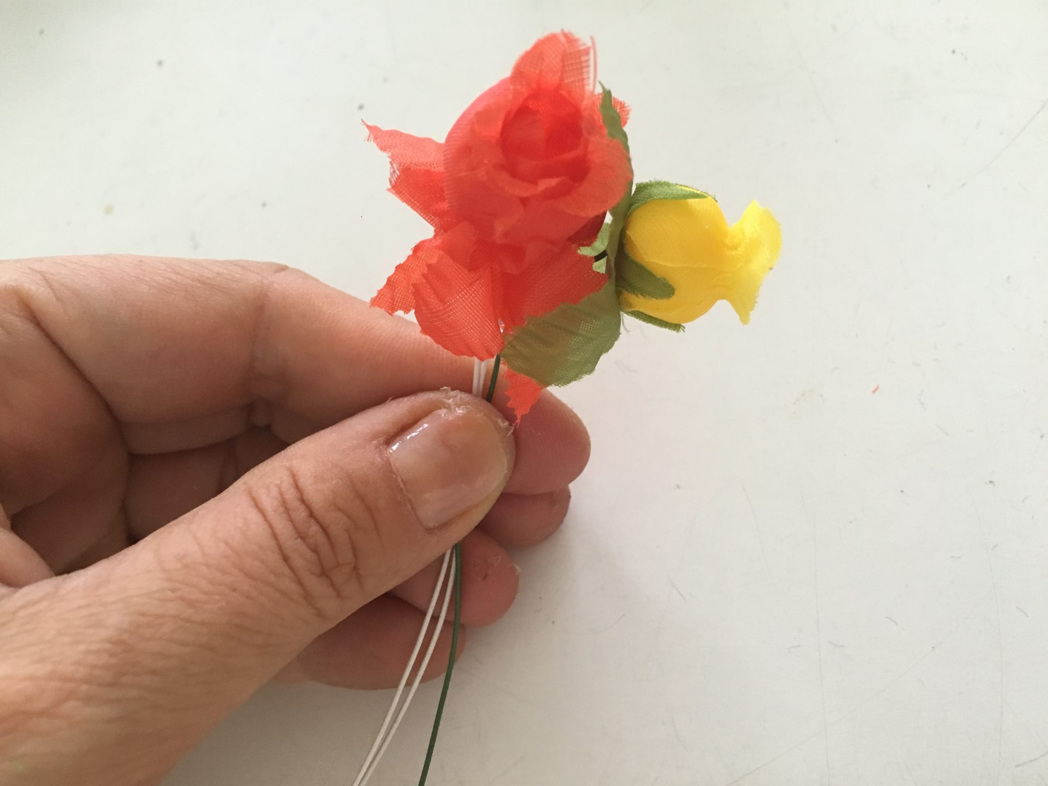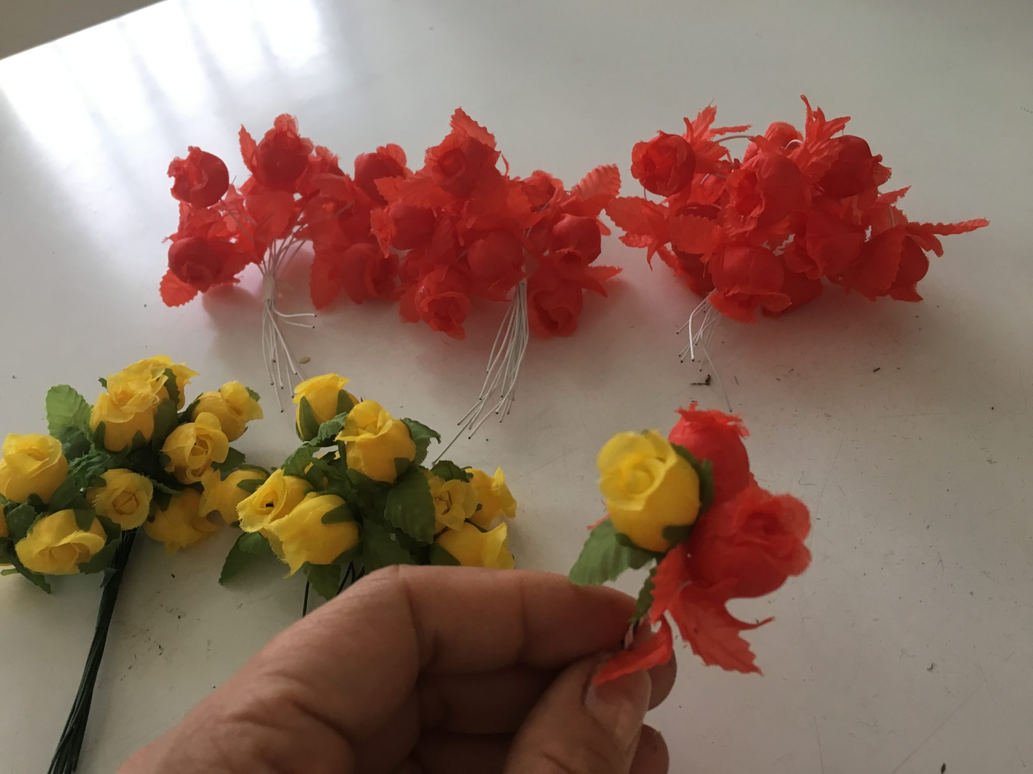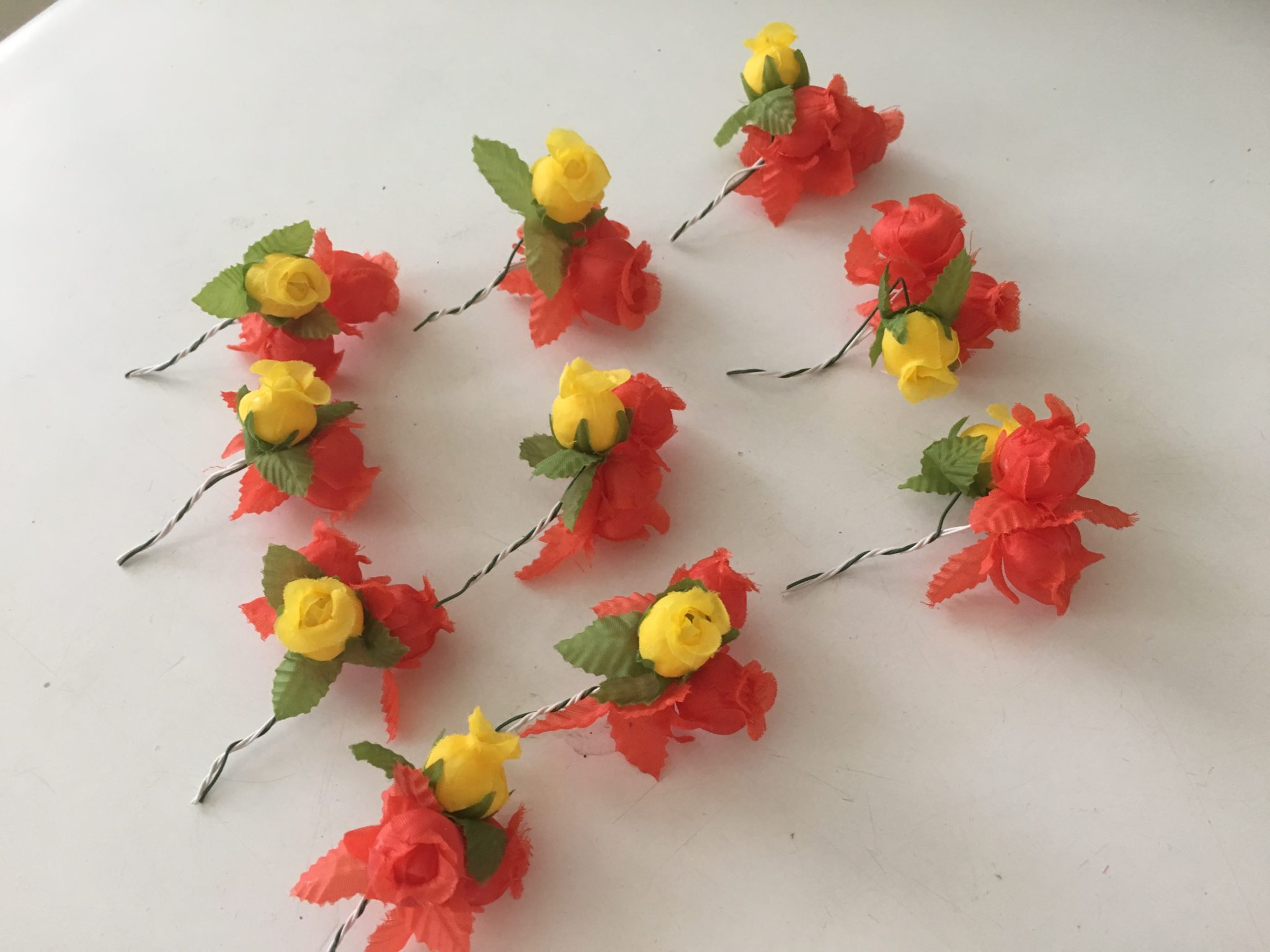 Despedacei esses buquezinhos e usei 2 rosinhas laranja e 1 amarela em cada, como no bolo da Mariana.
