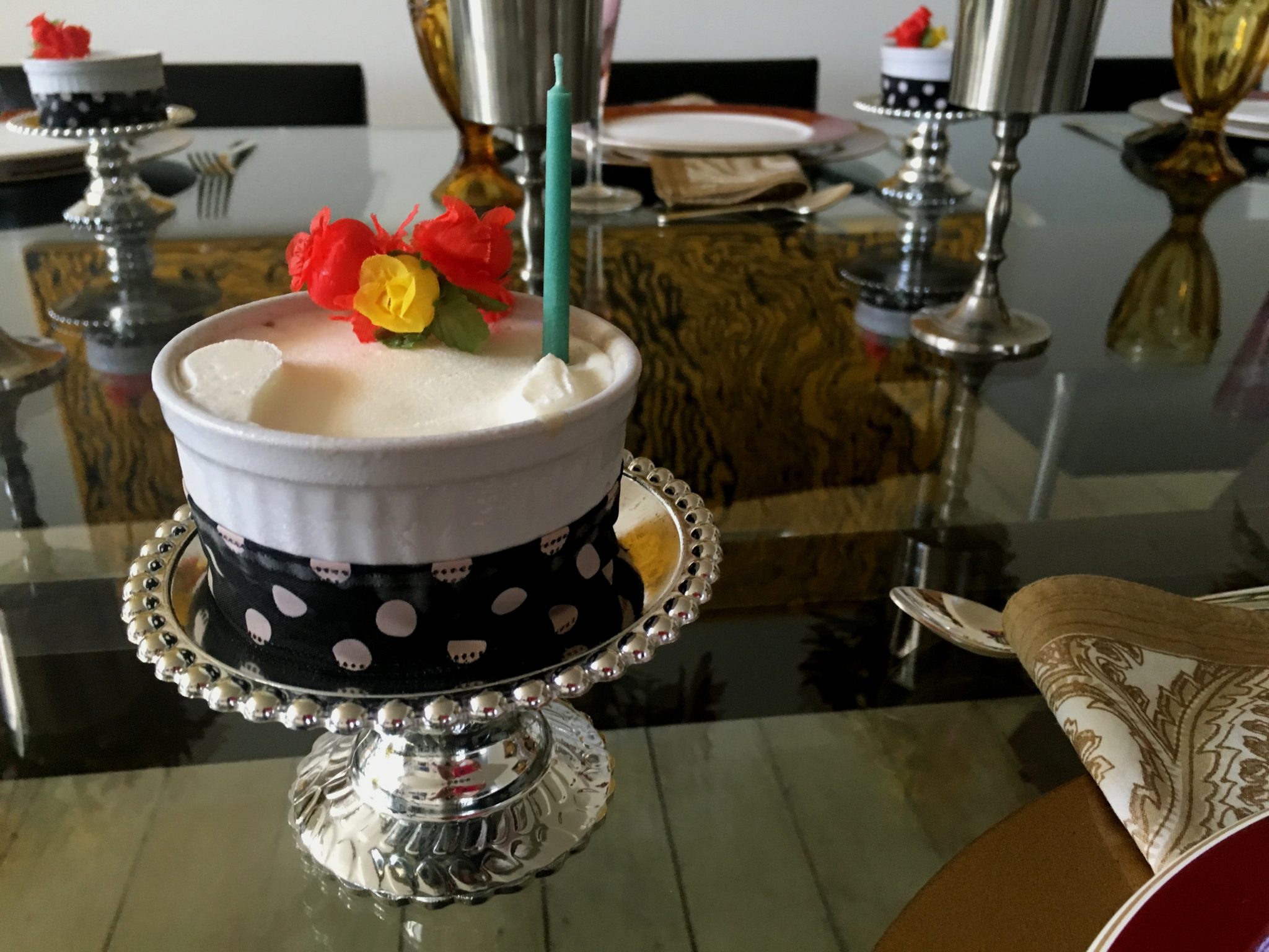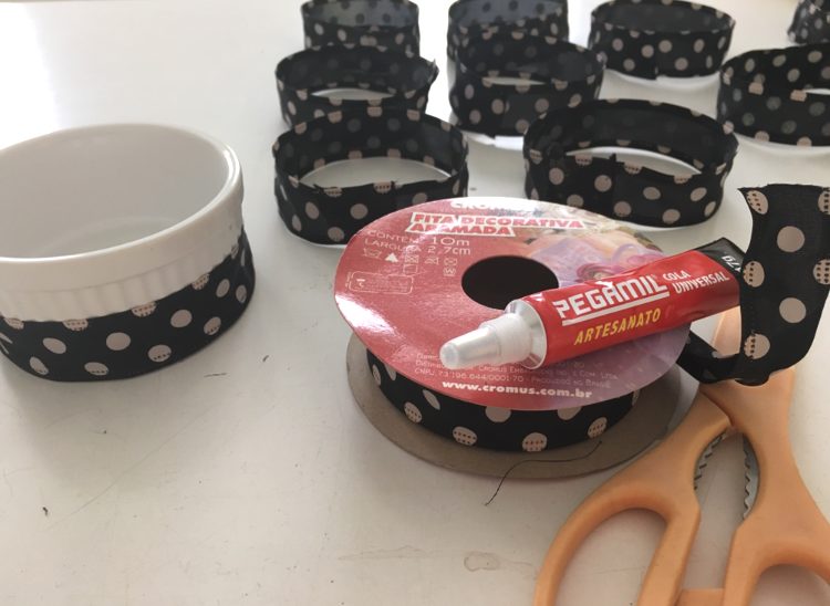 Montei mini-buquezinhos de flores para colocar em cima e colei uma fita preta e branca embaixo. Não achei xadrez como no modelo, comprei bolas. E o efeito ficou lindo tal e qual !
