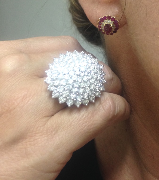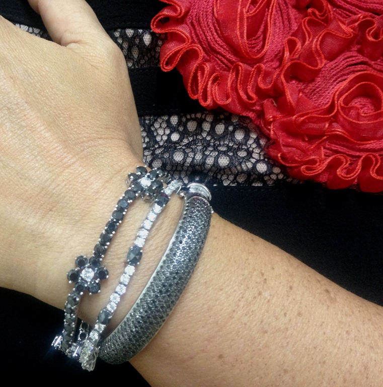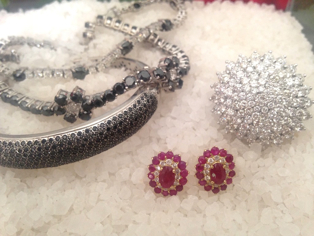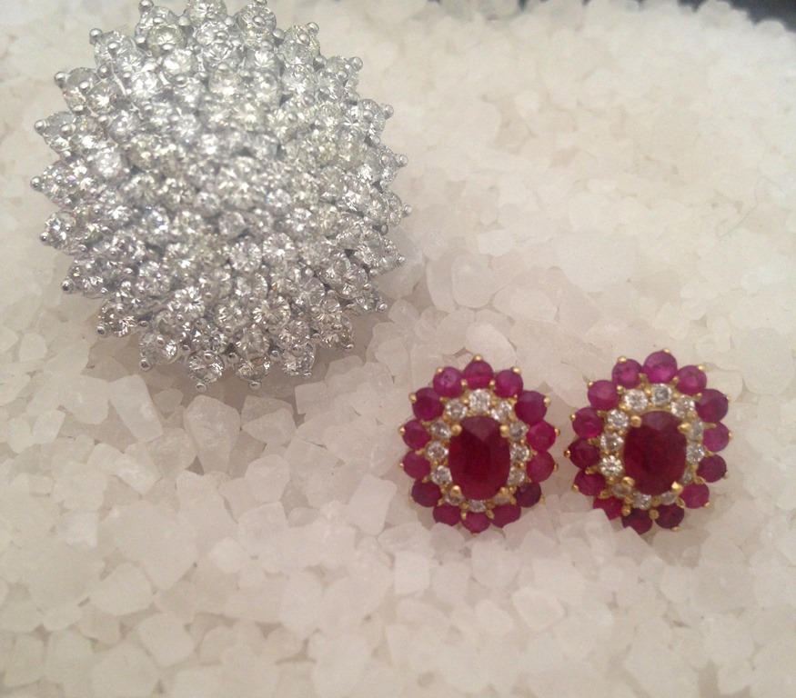 De jóias, apenas um brinco pequeno de rubis e brilhantes ( 10 x 330,00 = 3300,00 ) , um anel poderoso de brilhantes e 2 rivieras e bracelete em brilhantes negros e brancos.