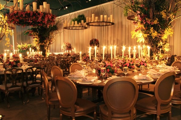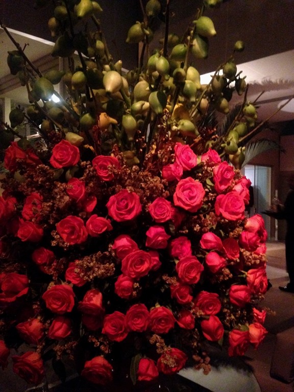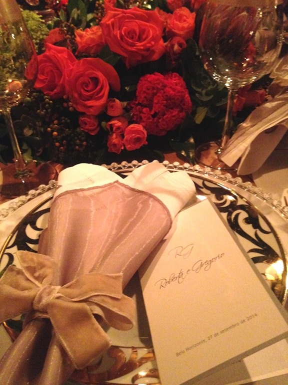 Rosas vermelhas tambem nas mesas e arranjos gigantes da festa