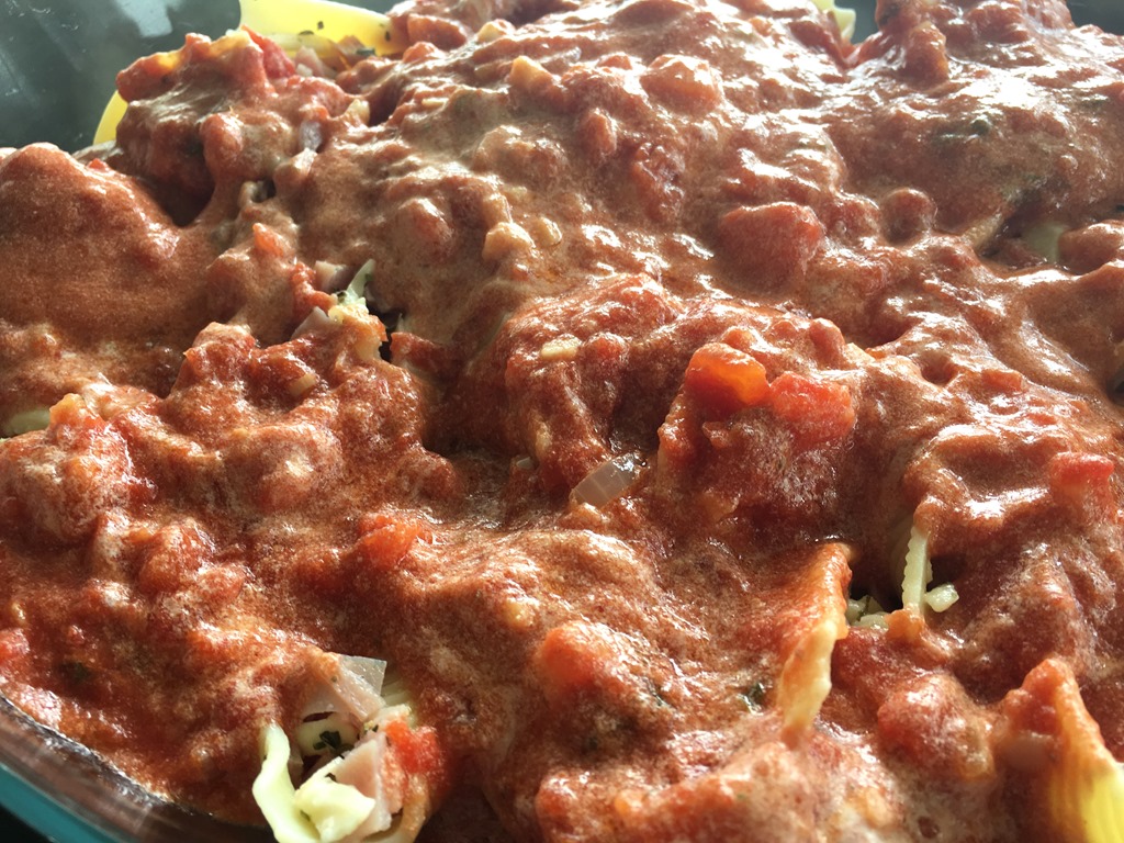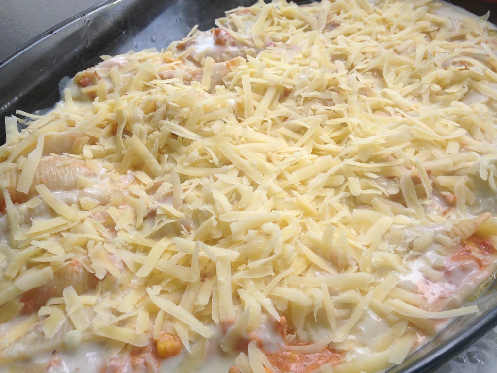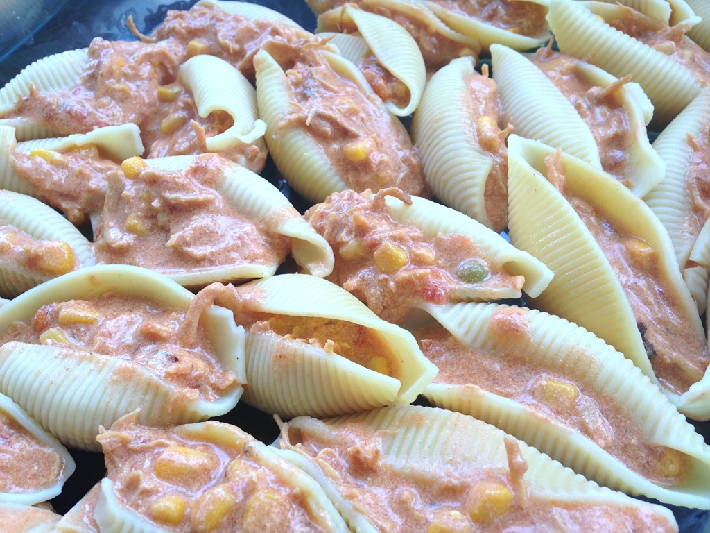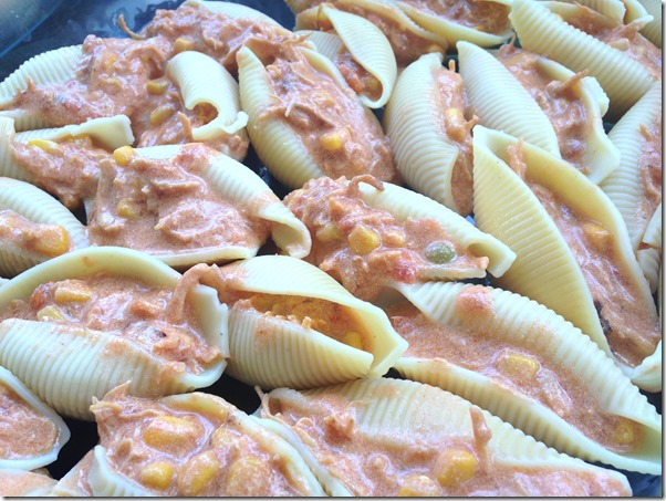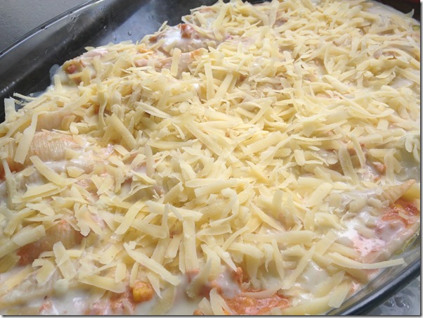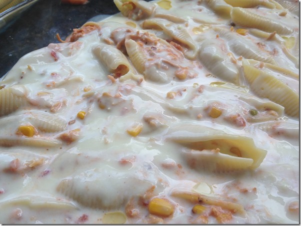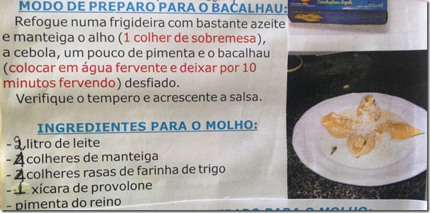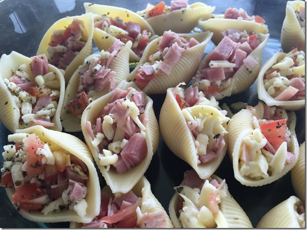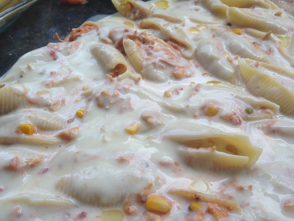 Servi essa salada de cenouras caramelizadas ( receita da Agnes ) – já dei receita AQUI . O prato de combate ( aquele que agrada a gregos e troianos – sempre faço um assim ! ) dessa vez foi CONCHIGLIONI recheado. A receita é de bacalhau, mas faço vario sempre com recheio de strogonofe de frango ou como dessa vez –