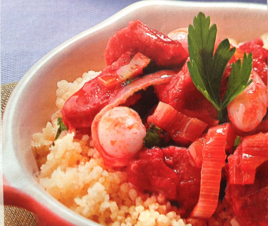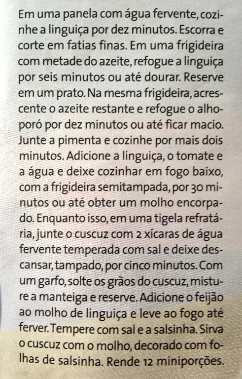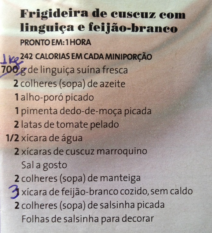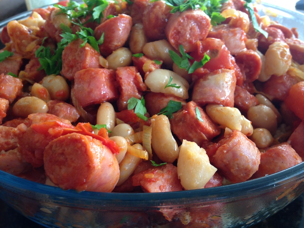 Fiz um almoço caseiro, só para a familia mesmo. Arroz, feijão preto, frango assado no forno com alecrim e tomilho regado a cerveja , farofinha de bacon, espinafre refogado no alho e esse Couscous de Linguiça com Feijão Branco. Sabe aquela comidinha que agrada a todos? Pois é: tem dia que é isso que o povo quer! rsrs