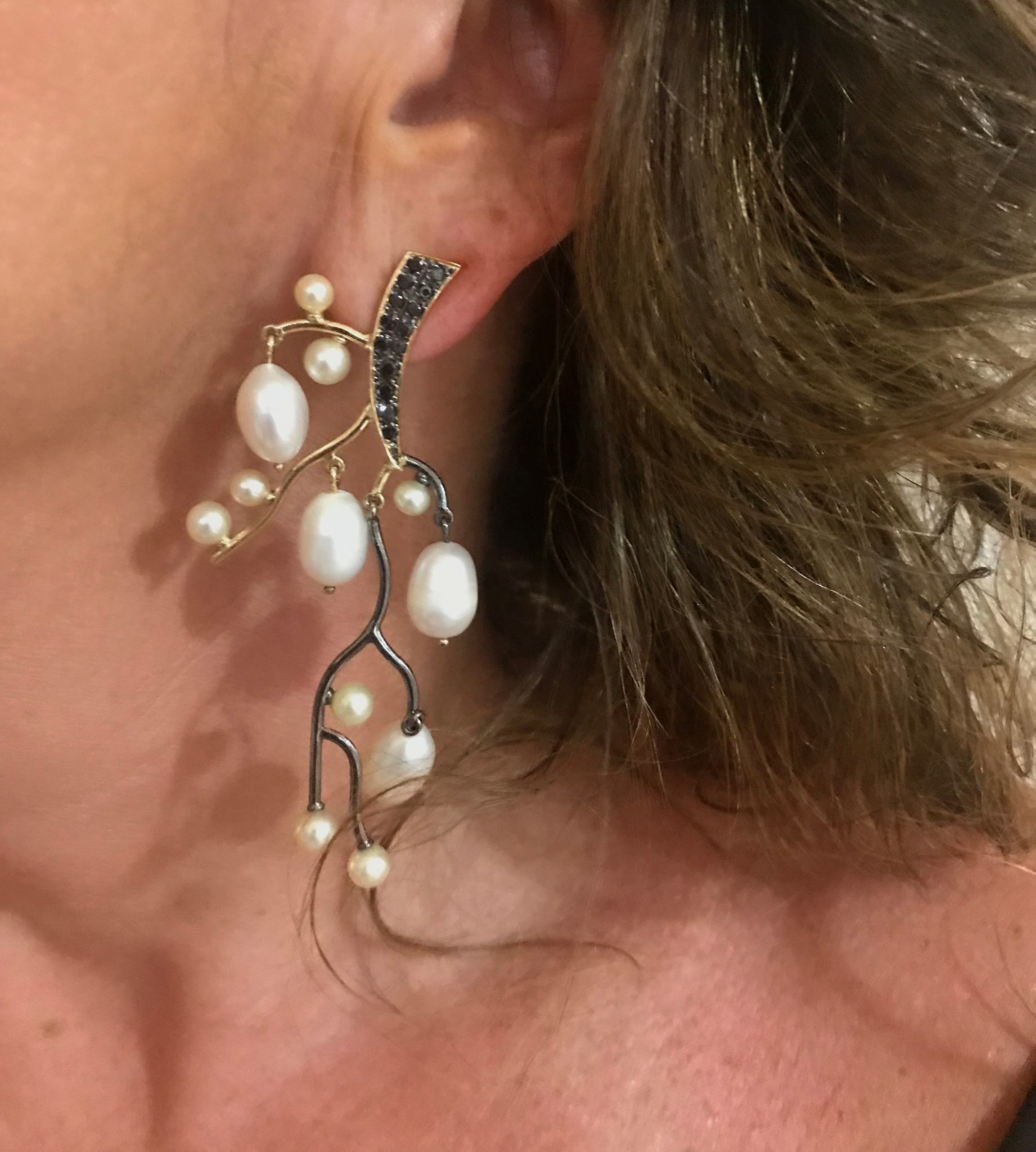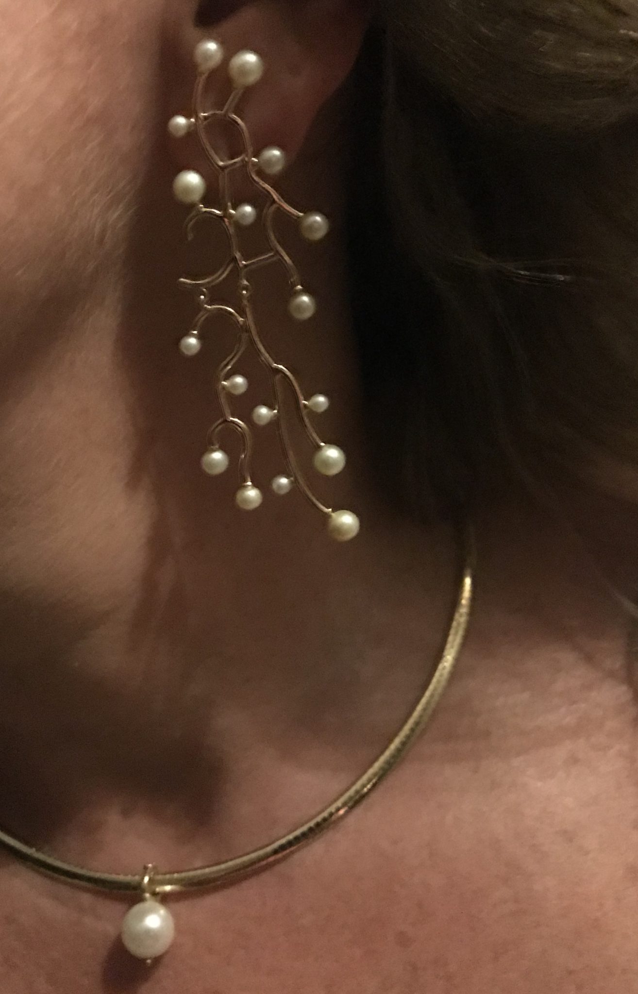 Esse brinco é lindo, né? São galhos de pérolas. Usei com aro e um pingente de pérola e amei!