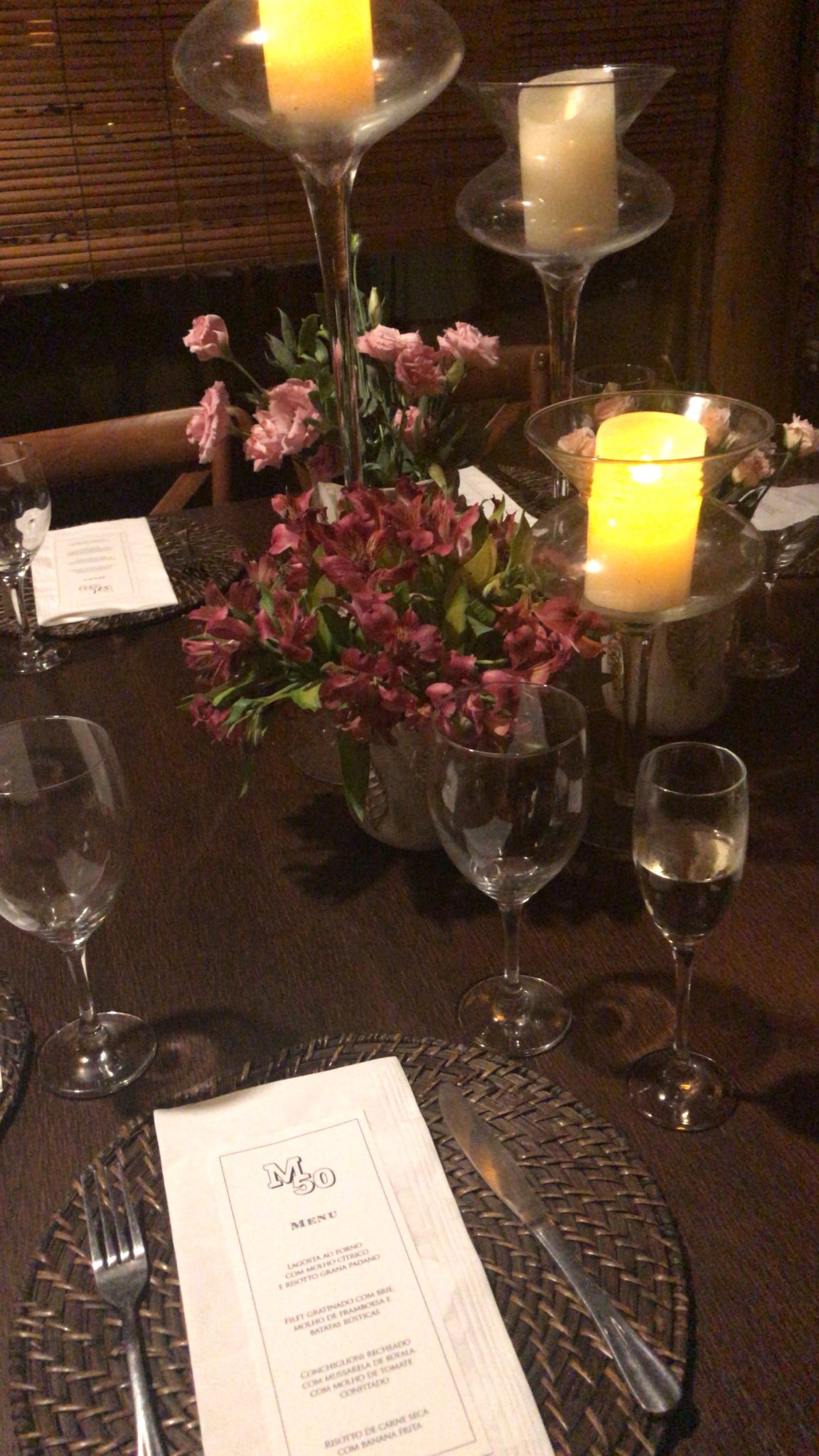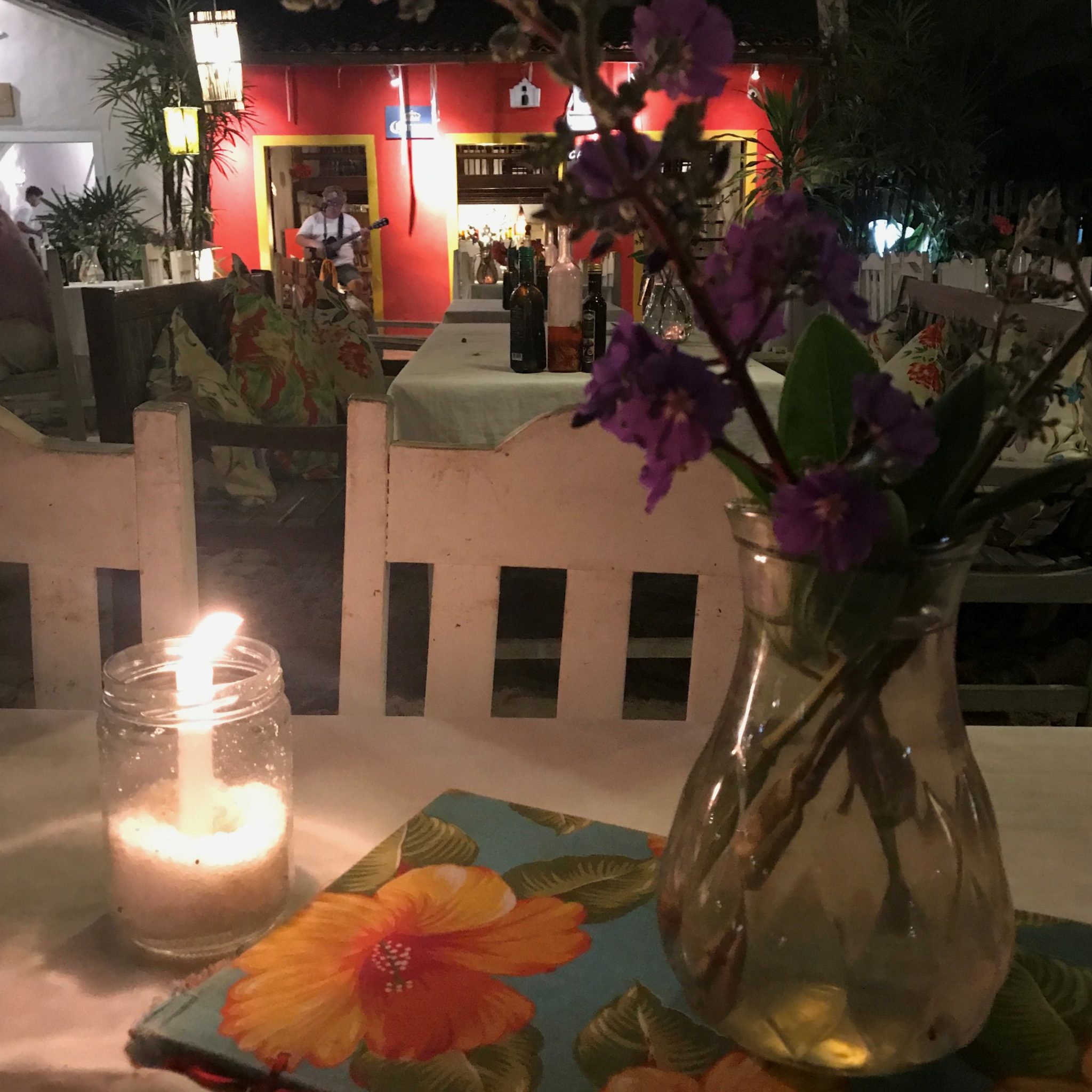 Repare nos detalhes : cardápio de chita; vela no vidro com sal grosso; floes naturais; e uma MPB tocando lá no fundo na altura certa… do jeito que tem que ser! Eu tenho vontade de sair só assim: