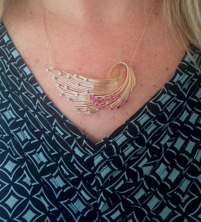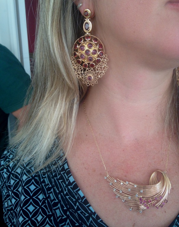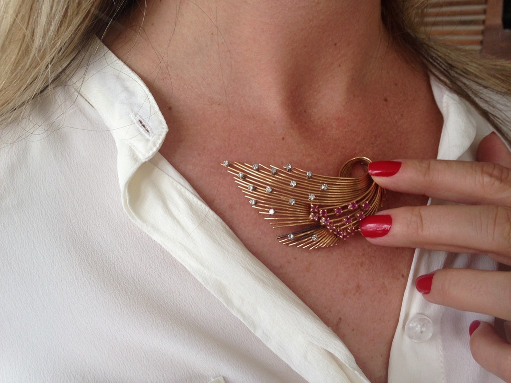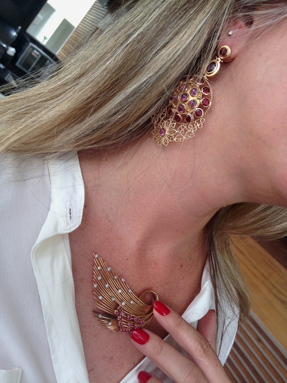 Patricia ganhou de sua sogra um broche antigo em ouro rosê, e preferia usá-lo de alguma outra maneira. Ela tem esse brinco também em ouro rosê JÓIAS PD. Pensei em colar !
