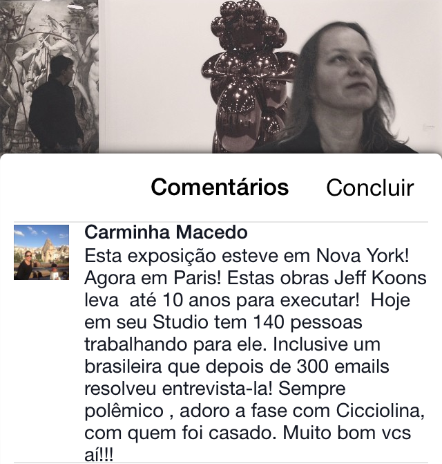 Os que o apoiam consideram que o anti-intelectualismo de Koons é uma resposta à arte elitista e inacessível – apesar dos preços exorbitantes de suas obras. Ao ser simples e divertida, a obra de Koons seria um caminho contra a arte/exclusão. Vale a pena ver estas famosas obras tendo por fundo a maravilhosa Paris e chegar à sua própria conclusão. Koons sempre me divertiu muito. Ah! E se não faltasse mais nada, ele ainda foi casado com a atriz pornô CICCIOLINA e fez com ela fotos eróticas abertas á visitação para maiores de 18 anos. Vale a visita. Diferente de tudo que vc já viu. Até 27/04/2015.