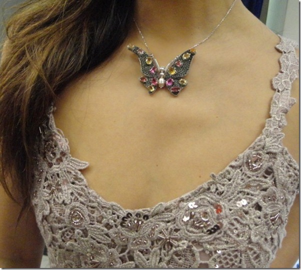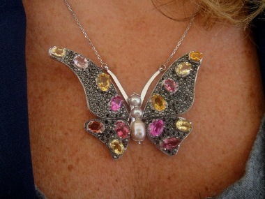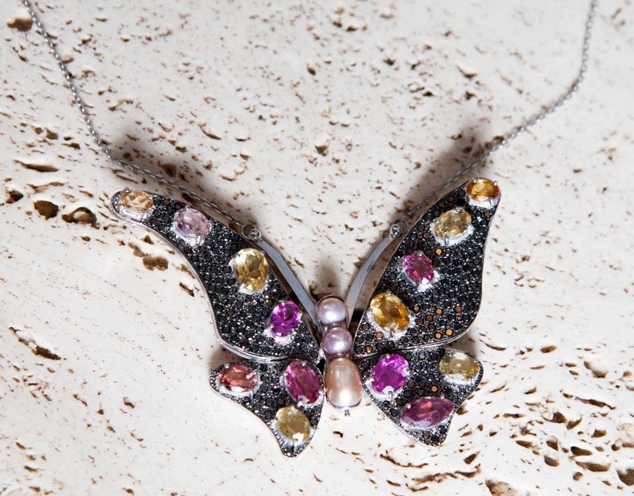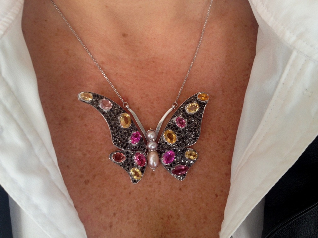 Colar Butterfly – em ouro branco, brilhantes negros e pedras coloridas. Corpo em pérolas!
