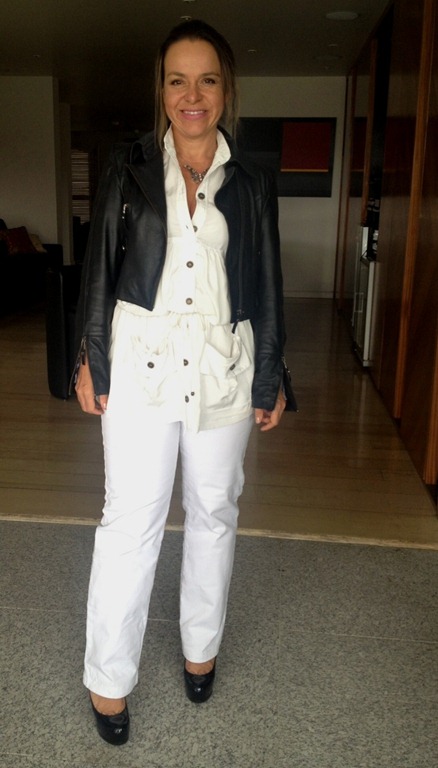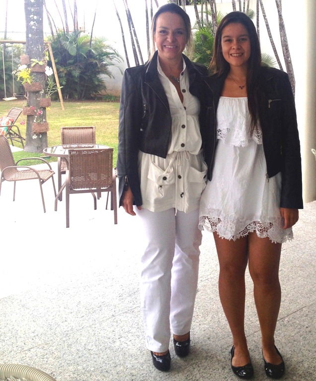 E não é que eu e a Rafa estávamos idênticas visualmente ontem no almoço? Não resisti, tive que registrar e postar ! De branco e jaqueta de couro !  Menina Coração vermelho Menina