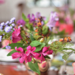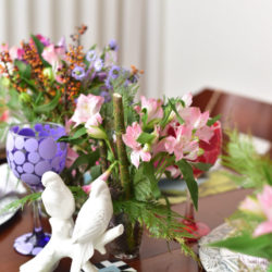 A harmonia de tons das flores montadas em vasos e cachepôs diferentes uns dos outros, produziu um resultado não só delicado, como também bastante feminino.