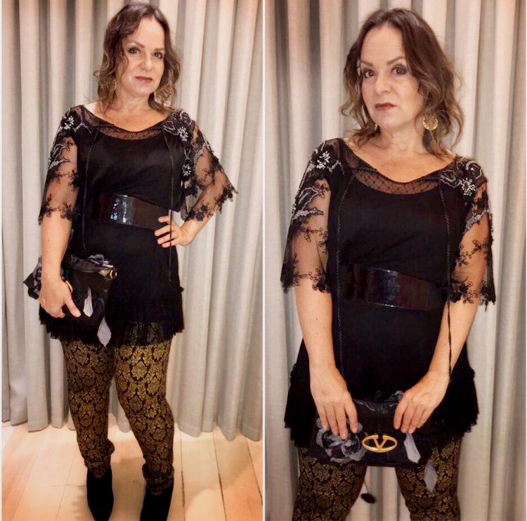 Misturei transparência com bordados, uma calça em jacquard dourado e uma ankle boot.