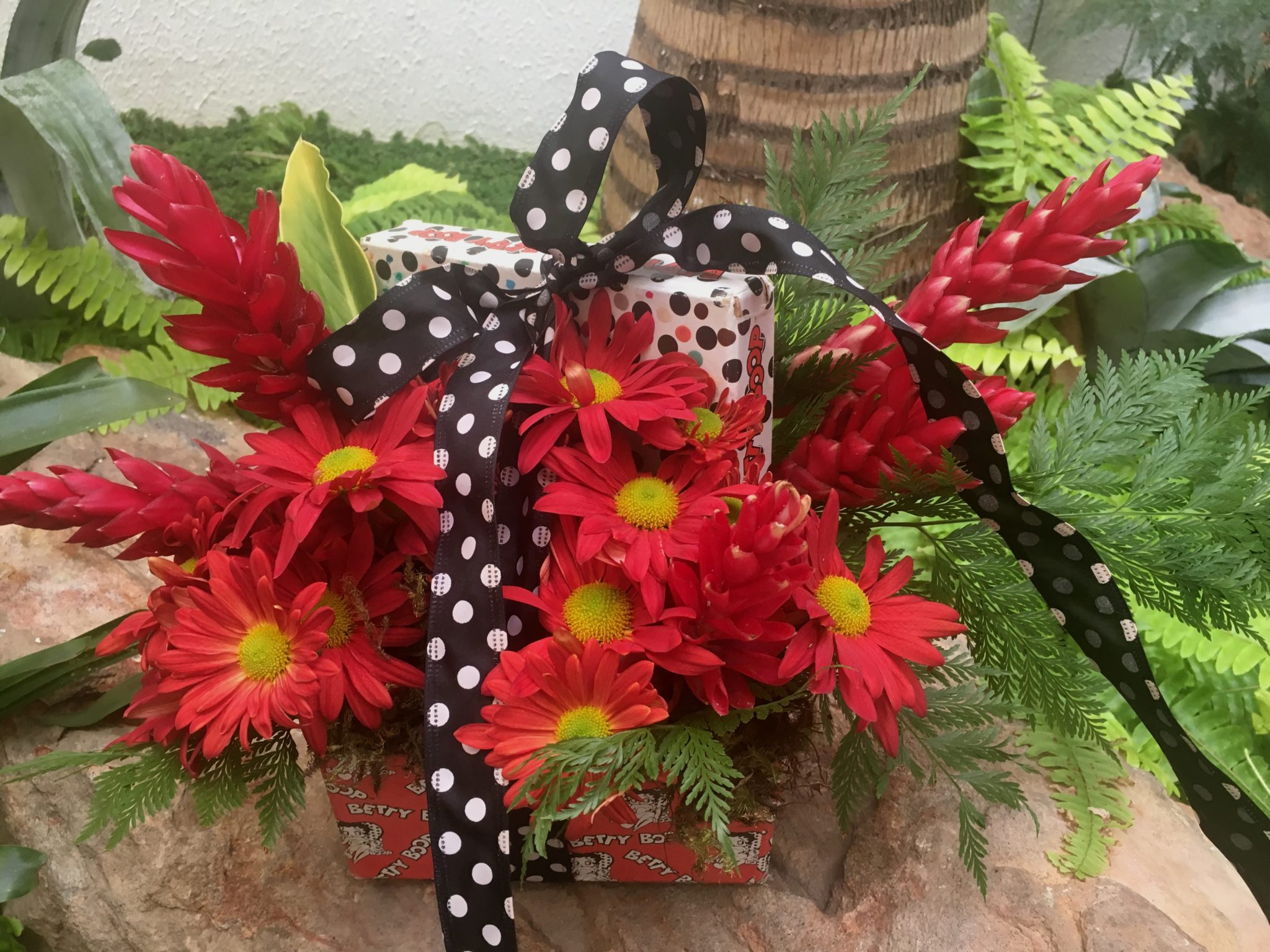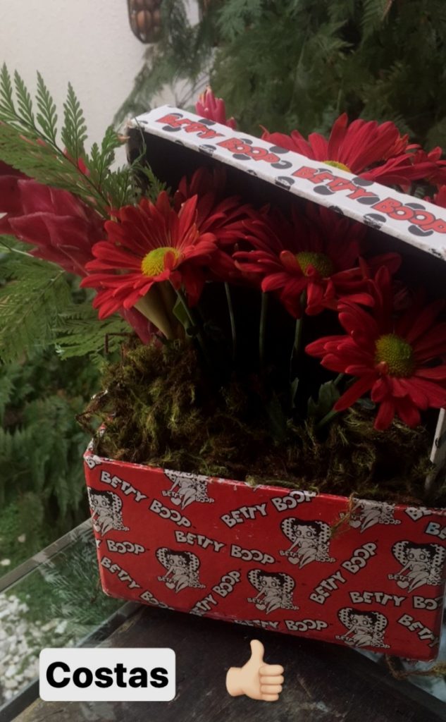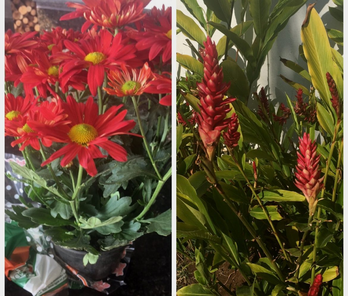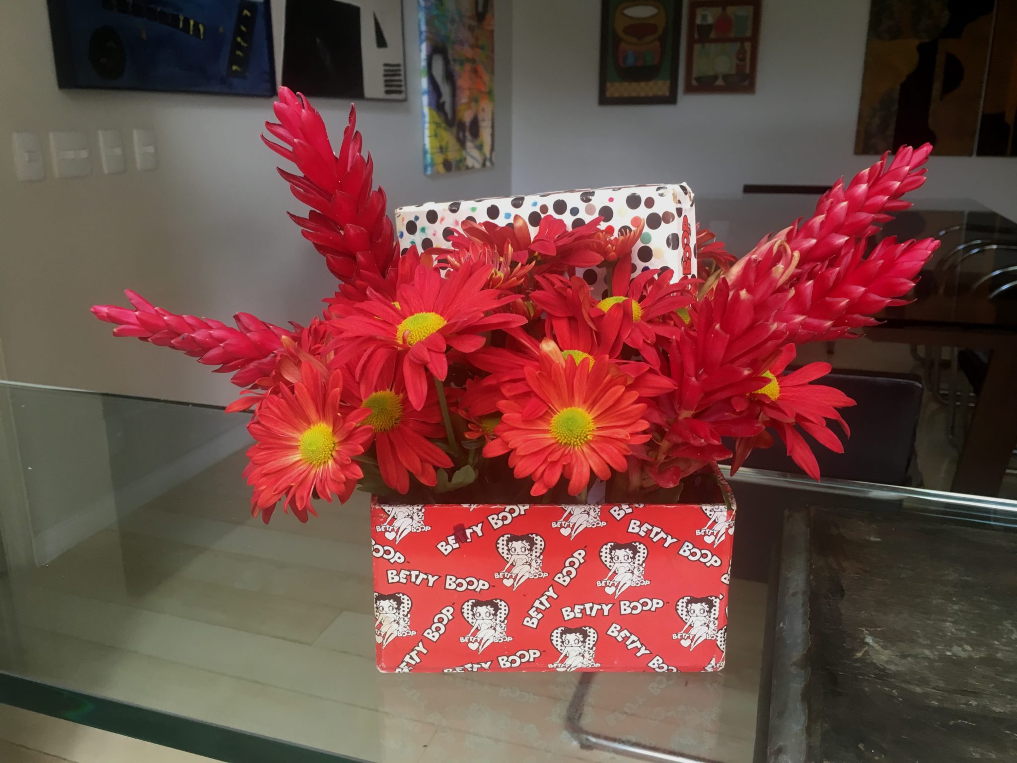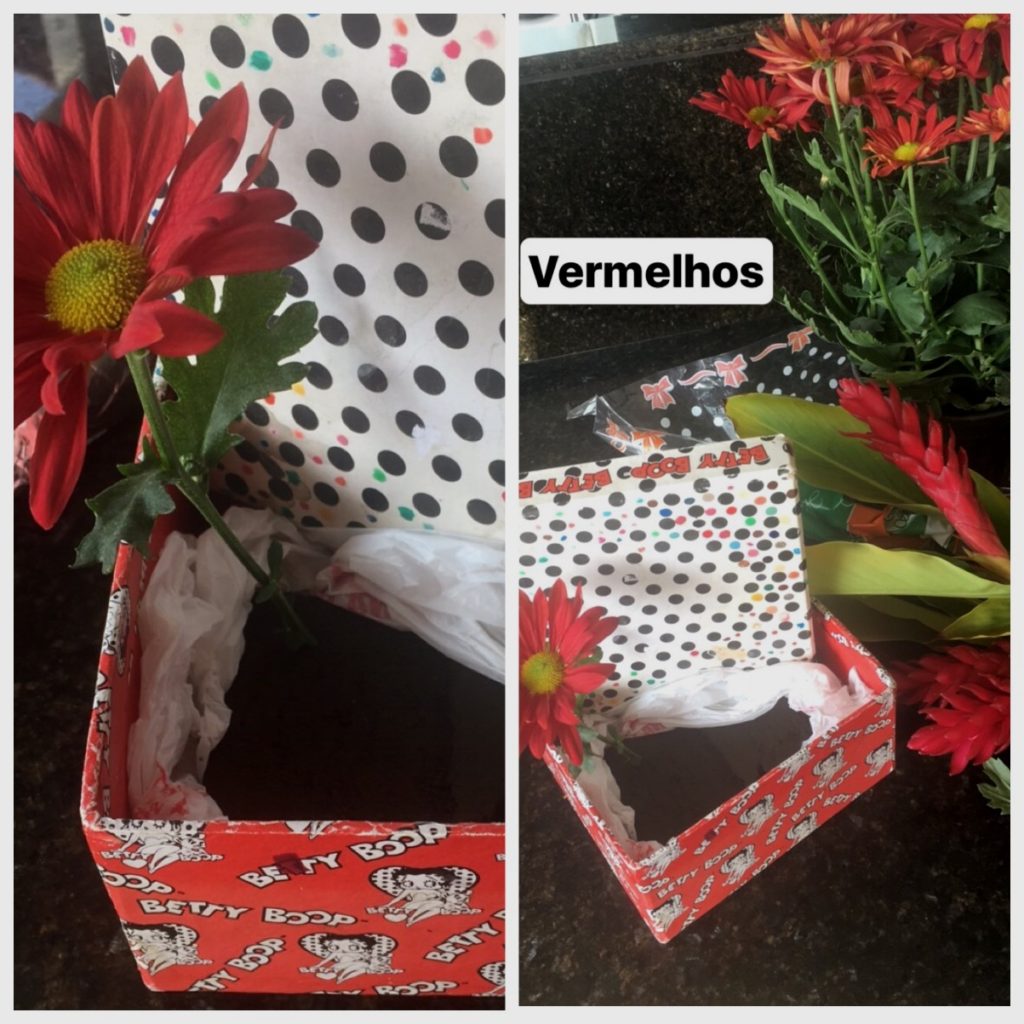 Comprei um vaso de crisântemos vermelhos ( R$12,00 ) e peguei as flores vermelhas ( alpíneas ) do meu jardim. Elegi o vermelho, pois combinava com a caixinha que eu já tinha.