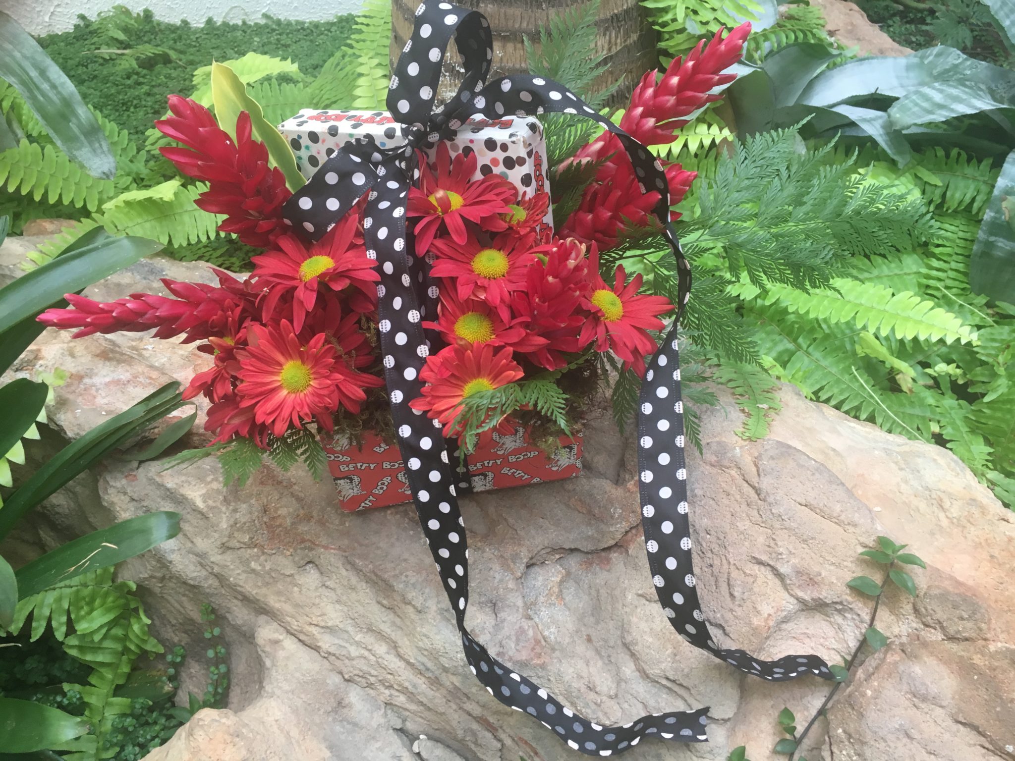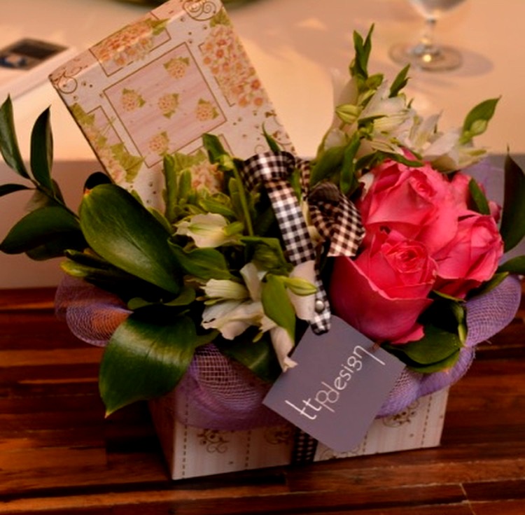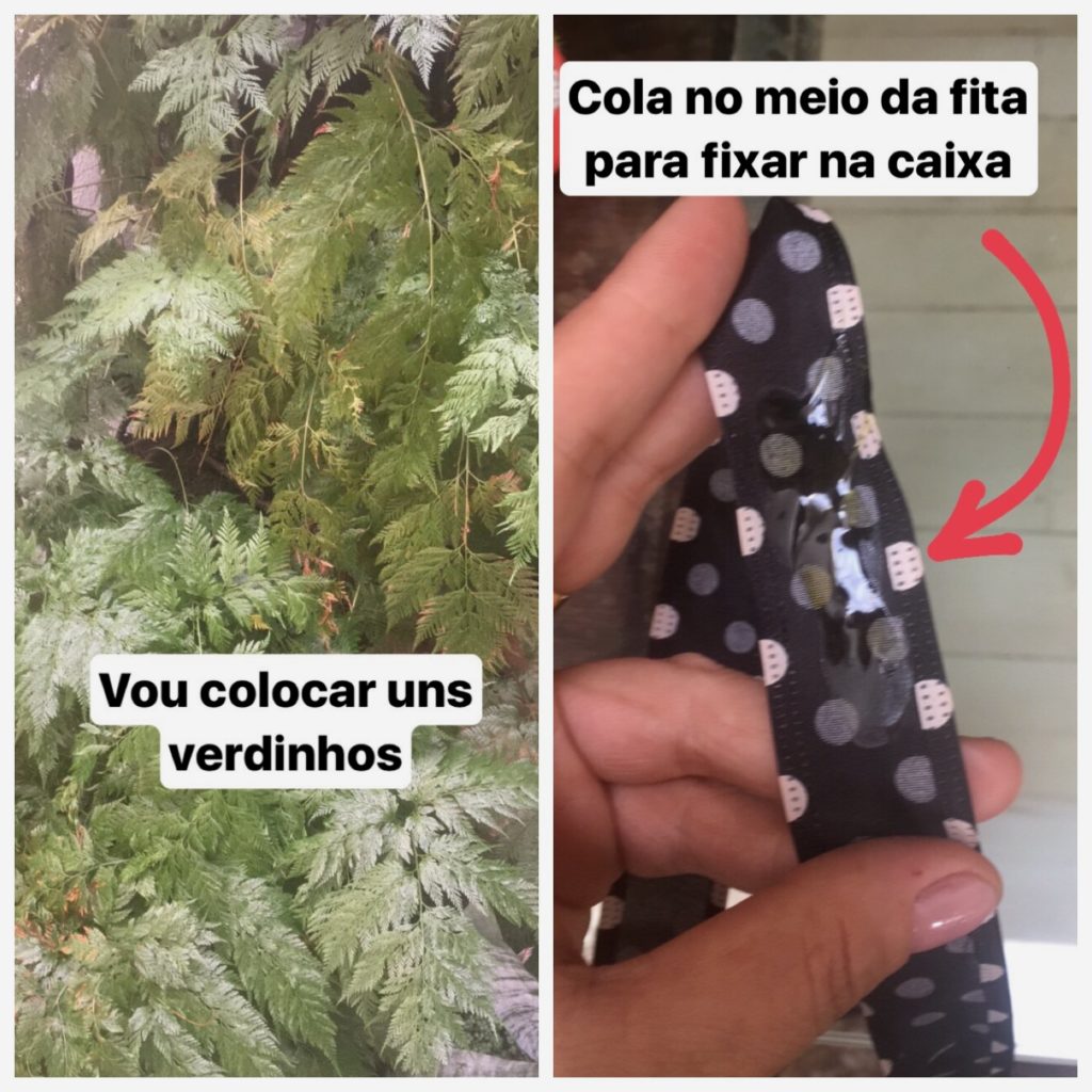 Peguei uns verdinhos do jardim também para dar leveza e movimento ao arranjo. Passei cola no meio de uma fita contrastante para que ela não se soltasse da caixa. Dei um laço fofo e parti para o abraço. Ficou lindo, né?
