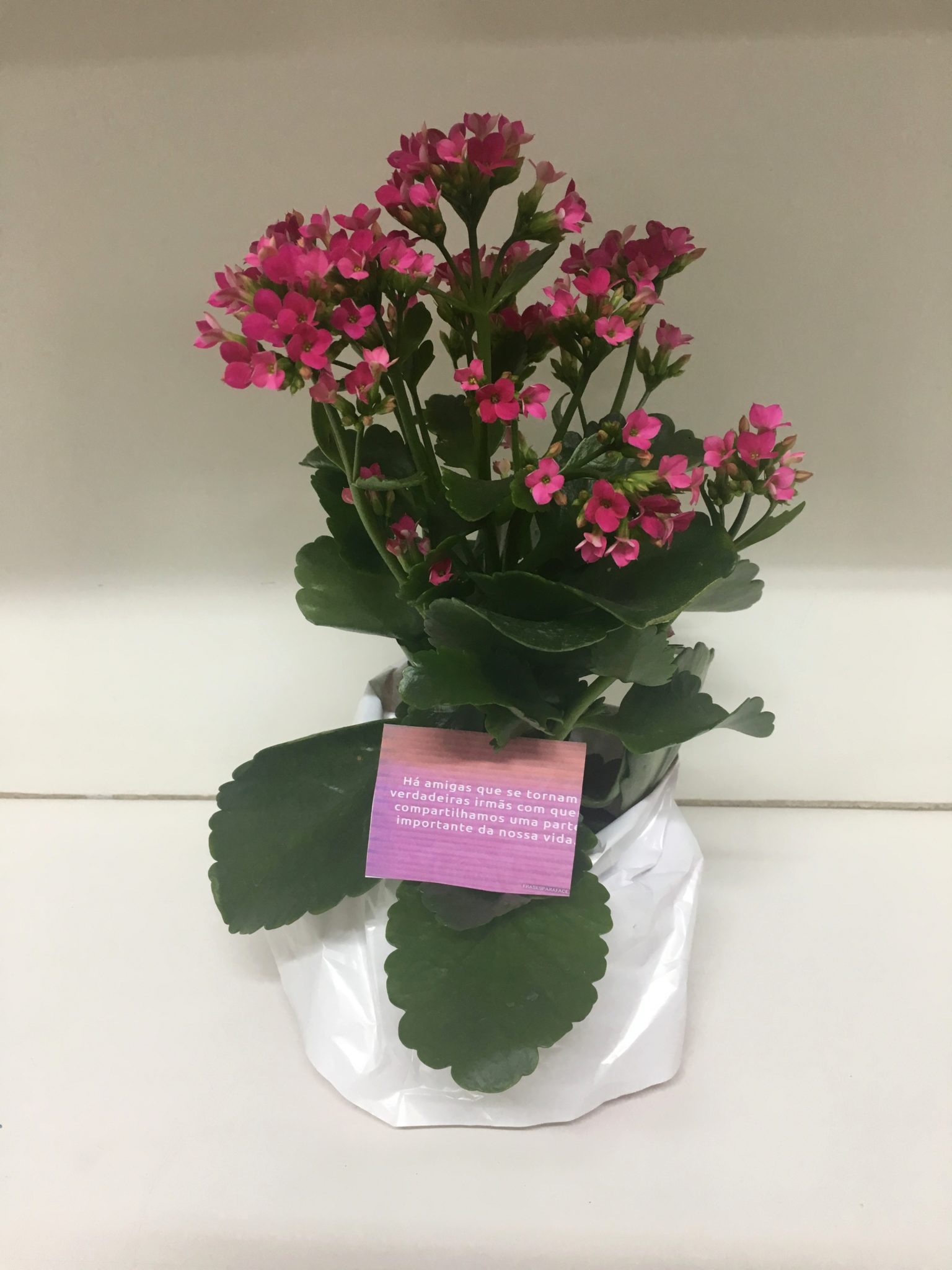 No final, ela ainda nos deu as flores da mesa, uma para cada. Um cartãozinho carinhoso trazia as seguintes palavras: “Há amigas que se tornam verdadeiras irmãs com quem compartilhamos uma parte importante de nossas vidas”.