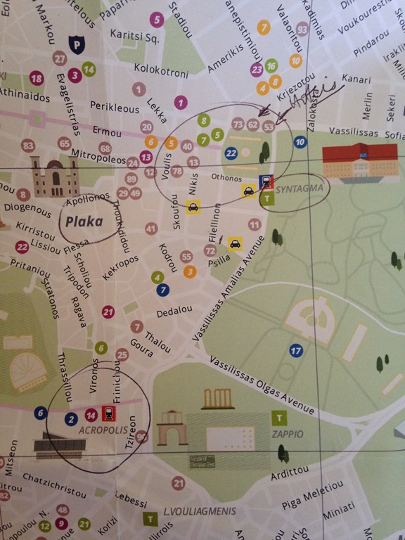 Essa é a parte que interessa : SYNTAGMA ( onde ficam os melhores hotéis e o comércio elegante ), o bairro PLAKA e a ACROPOLIS. Os hotéis mais tradicionais são o KING GEORGE e o GRAND BRETAGNE . Me foi sugerido pela agência BBoutique ficar em um hotel boutique com design dos brasileiros Irmãos Campana: o NEWS HOTEL. Não fica exatamente na praça como os outros 2, mas fica a 3 quarteirões. Vale mesmo pelo design – ah! e o restaurante, que é excelente! Dica: se for ficar, peça suíte ( hotéis design costumam ter quartos pequenos ) // ah! o preço é excelente custo X benefício!