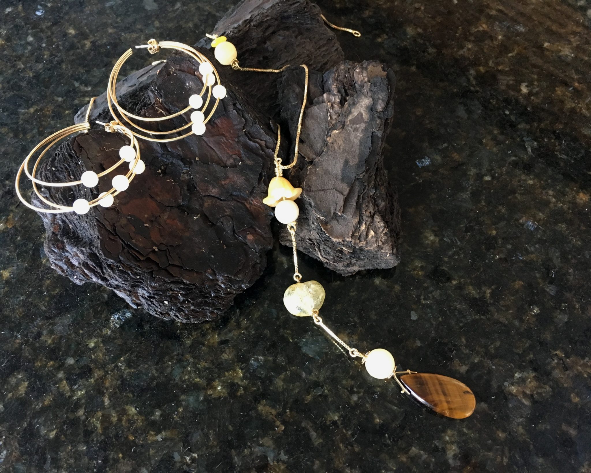 Essas peças não são um conjunto, mas se comportam bem como se fossem. A geometria das pérolas conversa bem com as bolas de ágata e essa mistura de tons terrodos funciona tão bem em looks de inverno quanto de verão. O ZEITGEIST do momento está com os olhos voltados para a América Latina, que encanta pela sua diversidade de cores e de materiais. Tudo isso provoca uma curiosidade no Hemisfério Norte, ávido por novidades. Aí entra a moda étnica, a comida com história, a música de raiz. Tá na moda usar couro rústico, crochê, babados e cores em cima de tons terrosos. Como se isso nos trouxesse um pouco de passado, valores e história. Testei looks de inverno e verão nesse mood e essas mesmas jóias funcionaram super bem, porque também  sçao peças únicas e cheias de personalidade. Isso é o chique do momento.