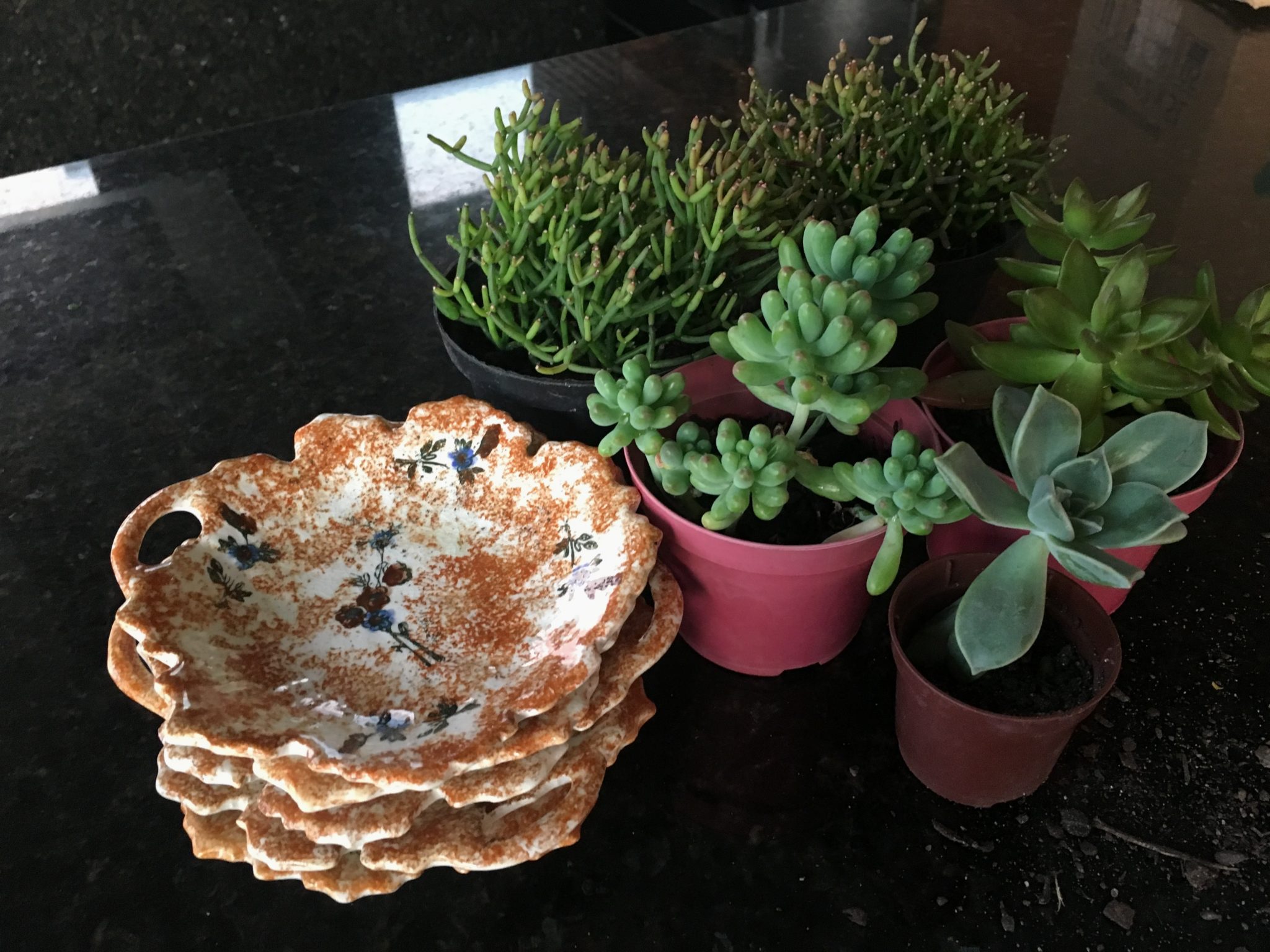 Pensei então em montar a minha mesa do Dia dos Pais com suculentas! Fui ontem com uma louça antiga que foi de minha avó até a flora e montei lá mesmo a minha versão. Cada vasinho desses custa entre 3 e R$10,00!