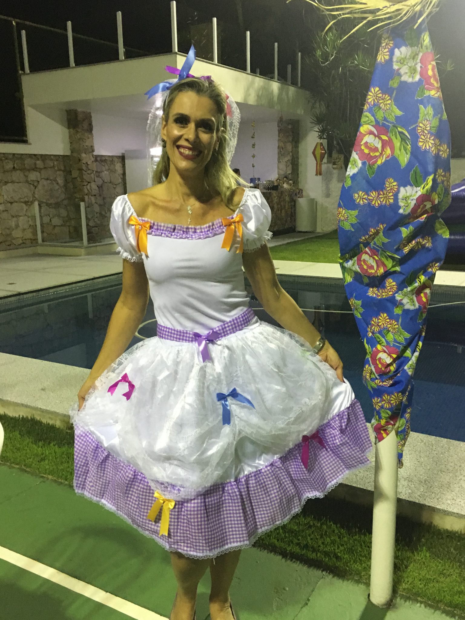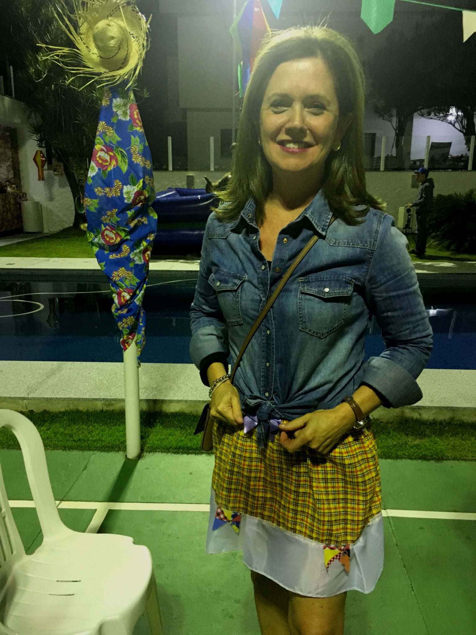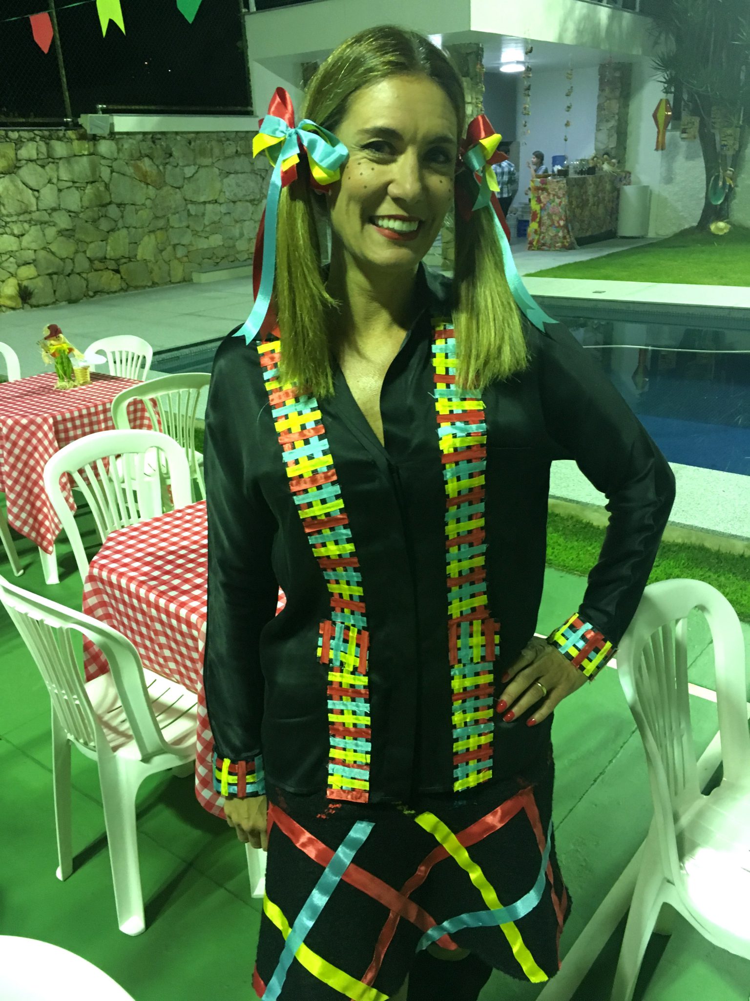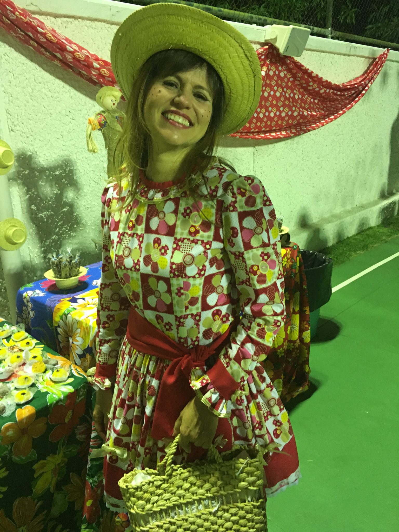 Uma amiga animadíssima fez uma festa incrível para 60 amigos na quadra de sua casa. Decorou tudo, pôs barraquinhas , contratou DJ e animação ! Teve quadrilha e casamento na roça ! rsrs A noiva? É claro que foi ela mesmo!