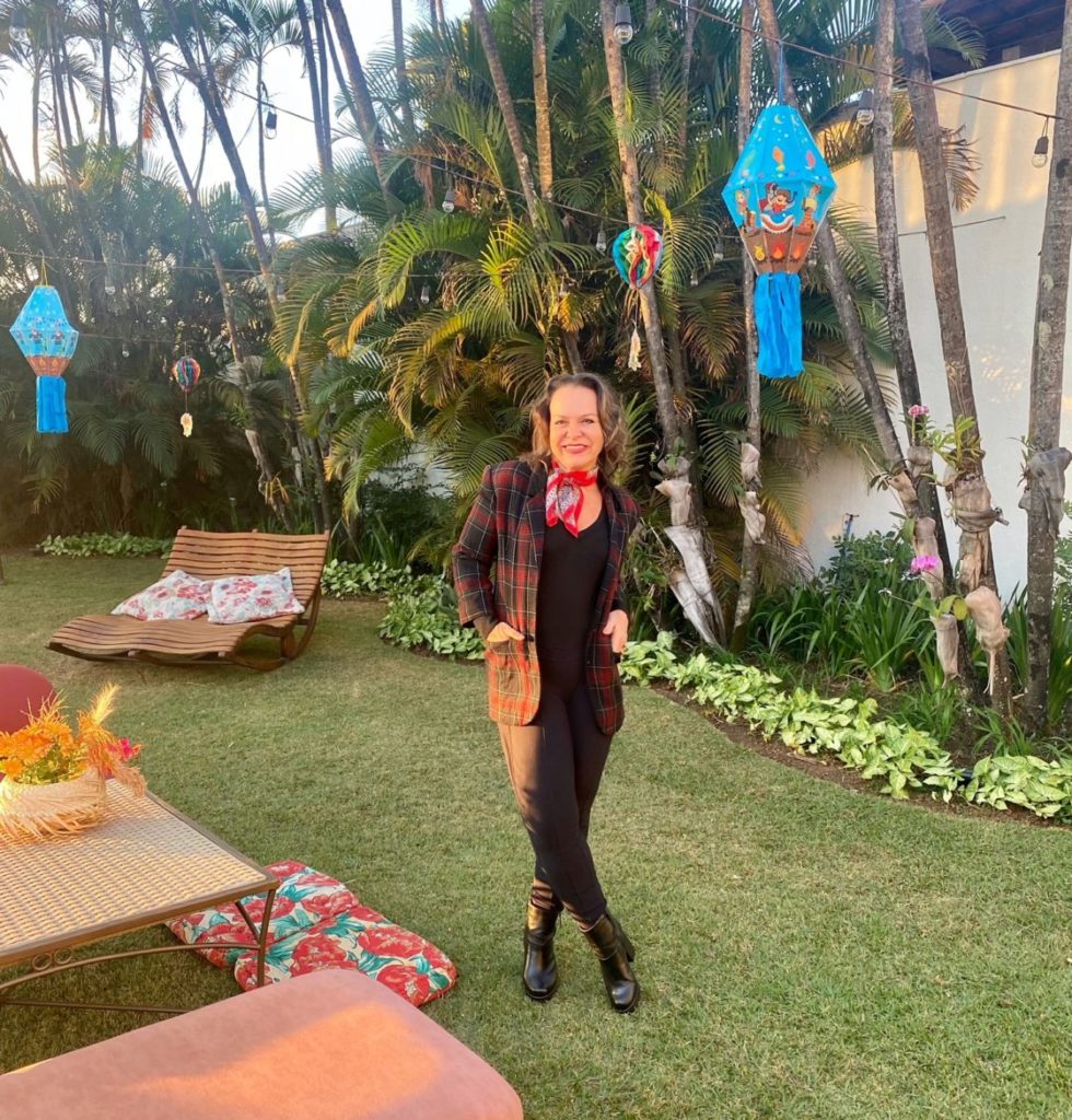 Eu mantive uma base all black com blazer xadrez e lencinho para dar um toque junino.