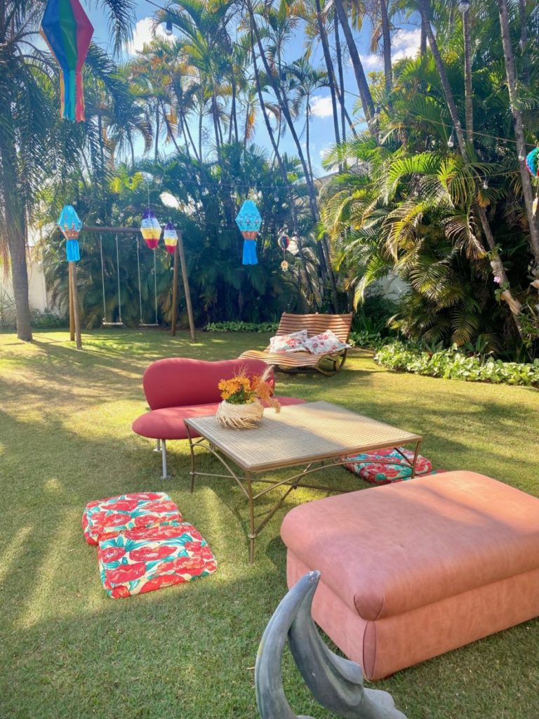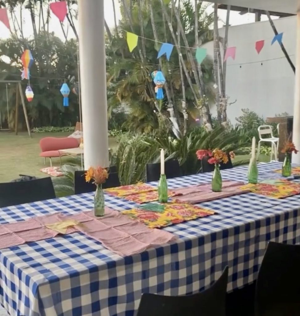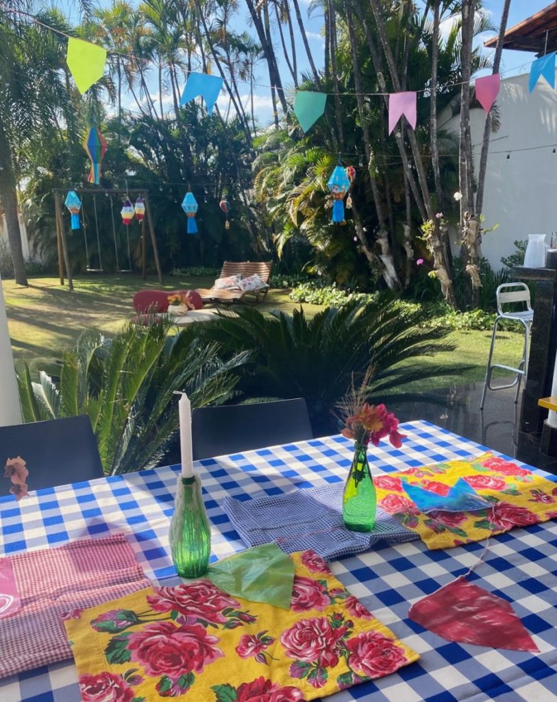 Começamos com essa ideia no ano passado, para 12 pessoas , já que BH estava toda fechada em lockdown pela pandemia. As filhas chamaram algumas poucas pessoas e decoramos com os enfeites de papel que já temos em casa. Na verdade, a Rafa faz uma canjicada na empresa todos os anos, e no ano passado, pela 1a. vez, trouxe para montarmos em casa. Coisa simples e barata de comprar, mas basta colocar, que já vira festa junina na mesma hora.