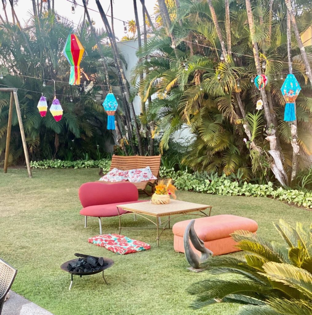 Penduramos balões coloridos no varal de luzinhas e de noite acendemos não só elas, como também o fogo de chão.