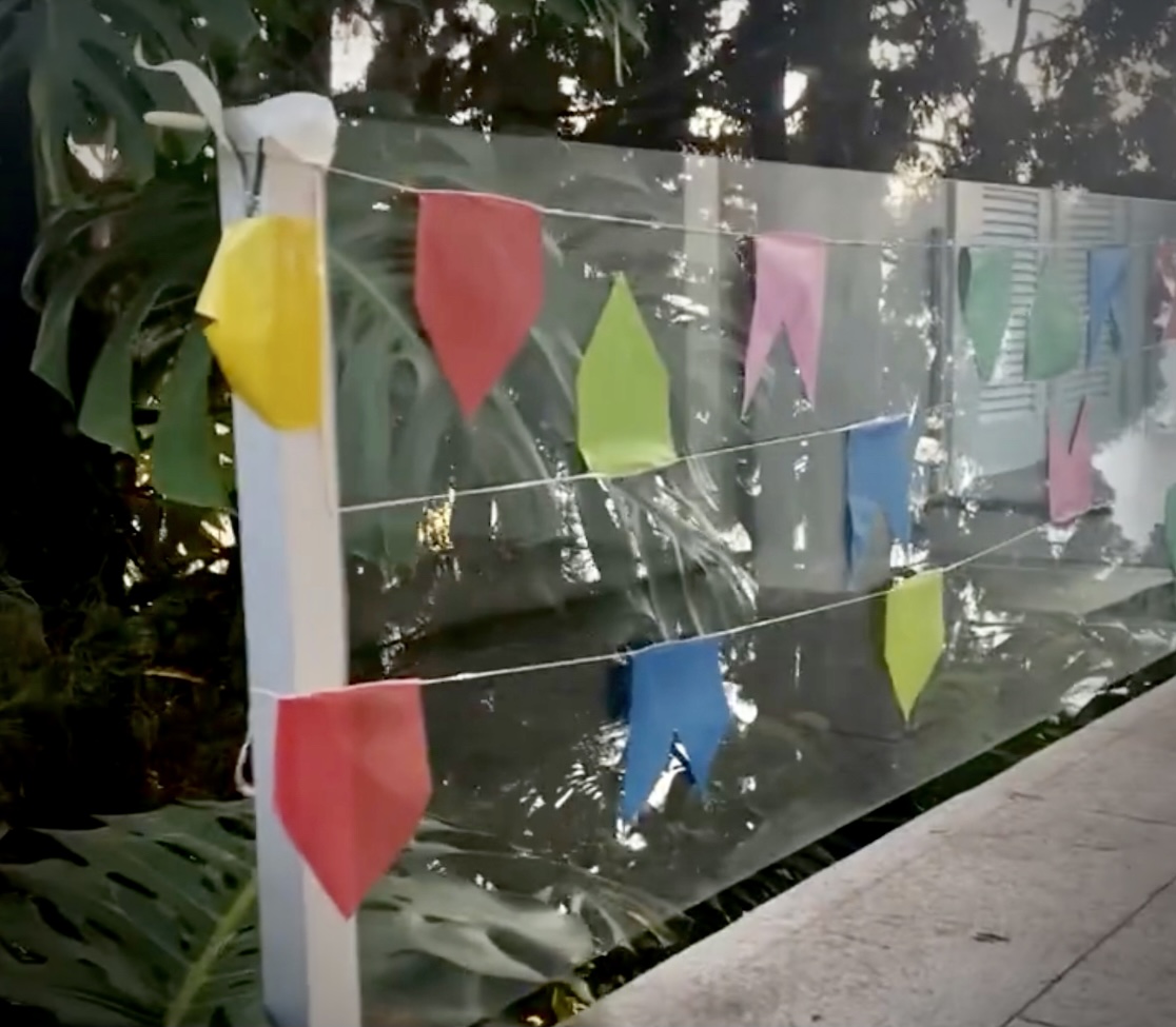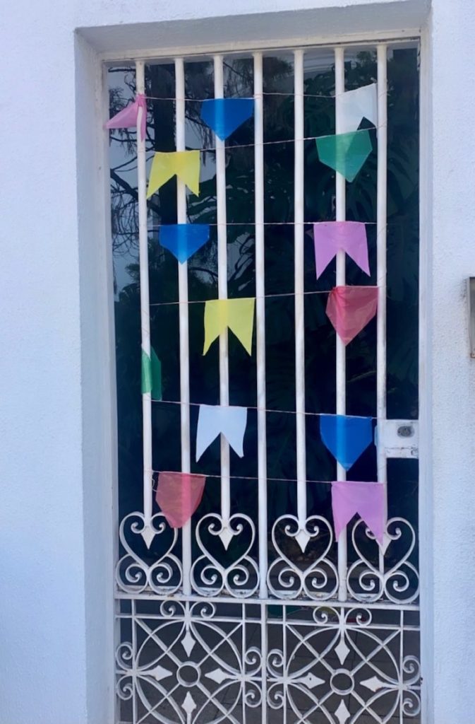 Eu gosto de dar uma “decoradinha básica” desde a entrada e então, já coloquei bandeirinhas no portão.
