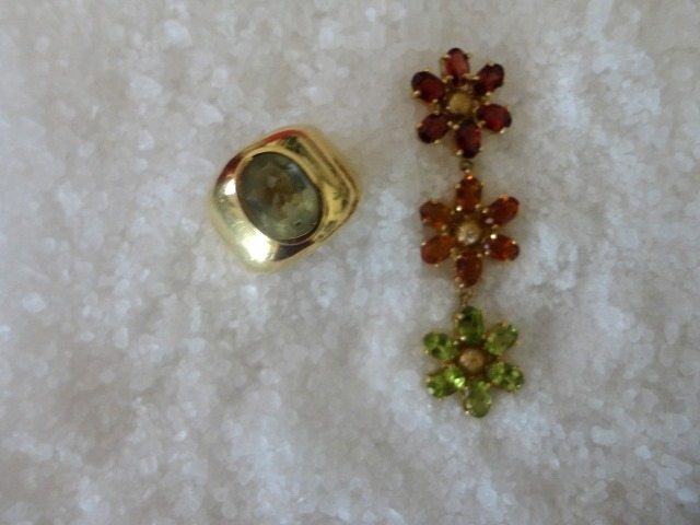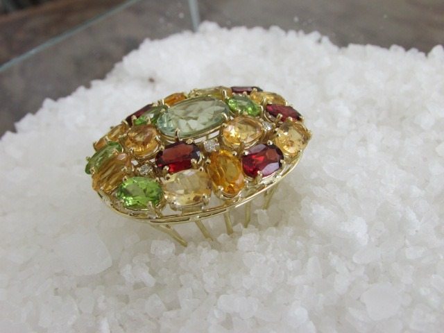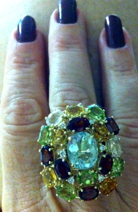 Esse anel foi feito a pedido de uma cliente que queria aproveitar a sua pedra do meio e ter um novo anel bem colorido. Ao fazê-lo proporcionalmente à pedra dela, ele ficou grande para o que ela tem costume de usar!