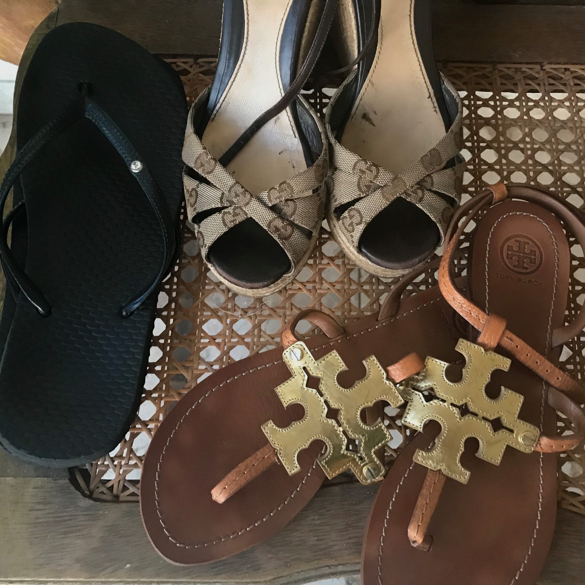 Para combinar com tudo isso, uma bolsa grande marrom, uma carteirona de palha, uma clutch dourada para as festas, uma rasteira com dourado, uma espadrille bege , 1 chinelo e 2 óculos. Esses foram todos os únicos acessórios.