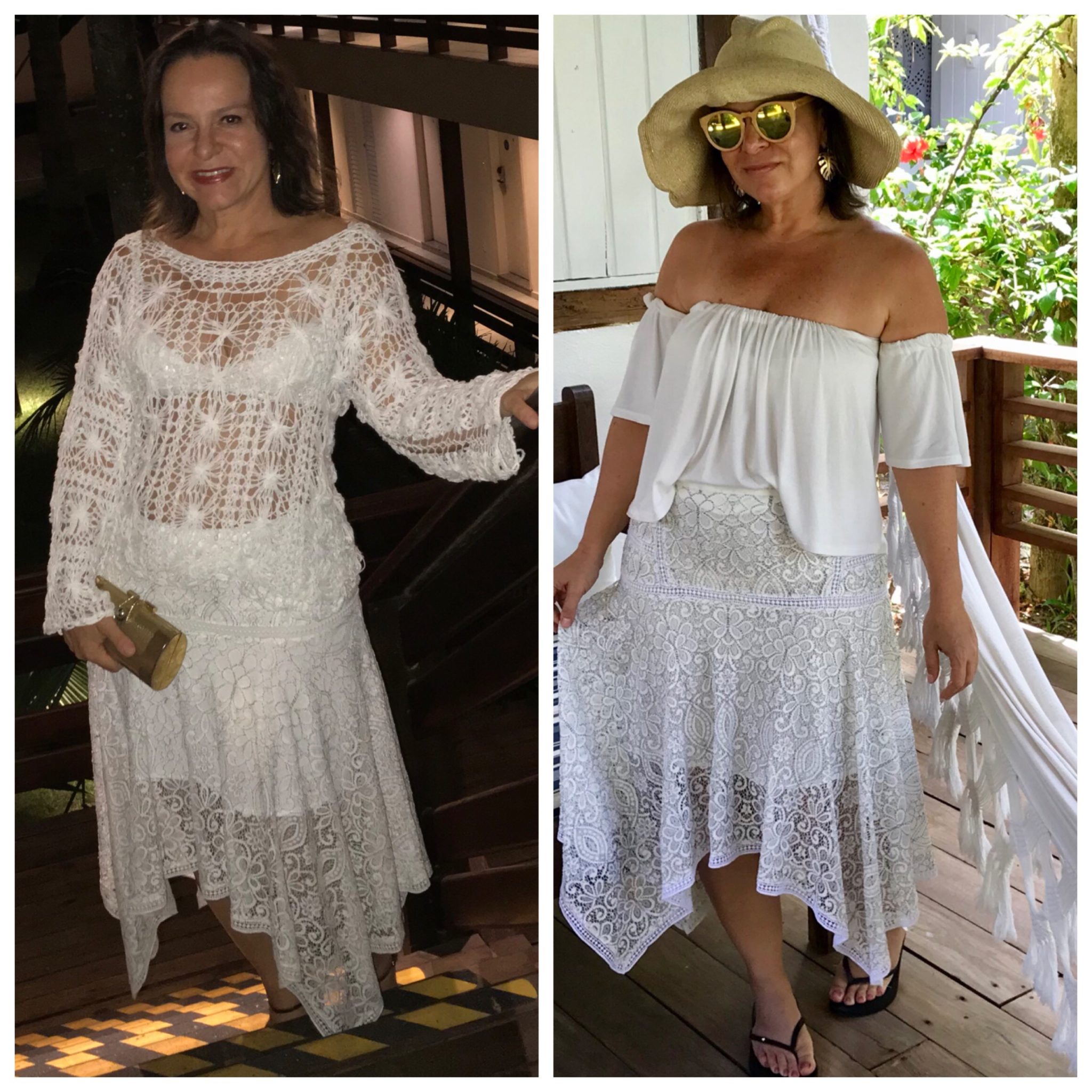 Dois looks brancos ( um look noite e um look dia ) , mantendo a mesma saia de renda TAHARI. Mantive também o mesmo Brinco Tropical JOIAS PD, que é mesmo a cara do verão.