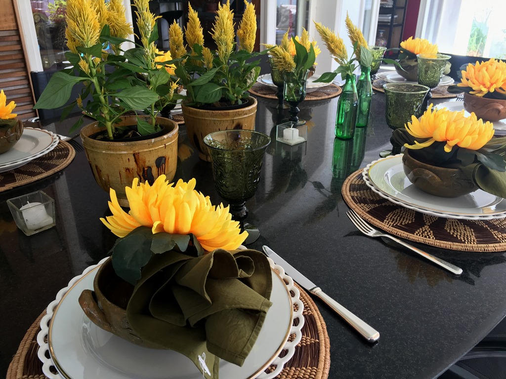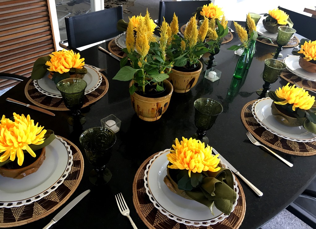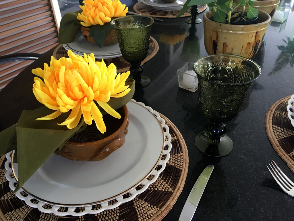Fiz a mesa bem brasileira , com flores amarelas compradas no supermercado mesmo. Aliás, cada vez complico menos : penso na cor, e compro o que tem em vasos . Facilita demais!