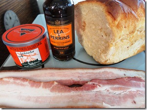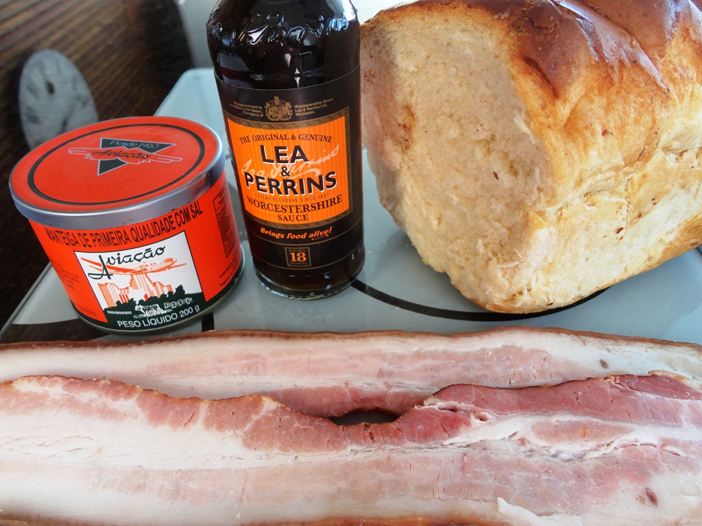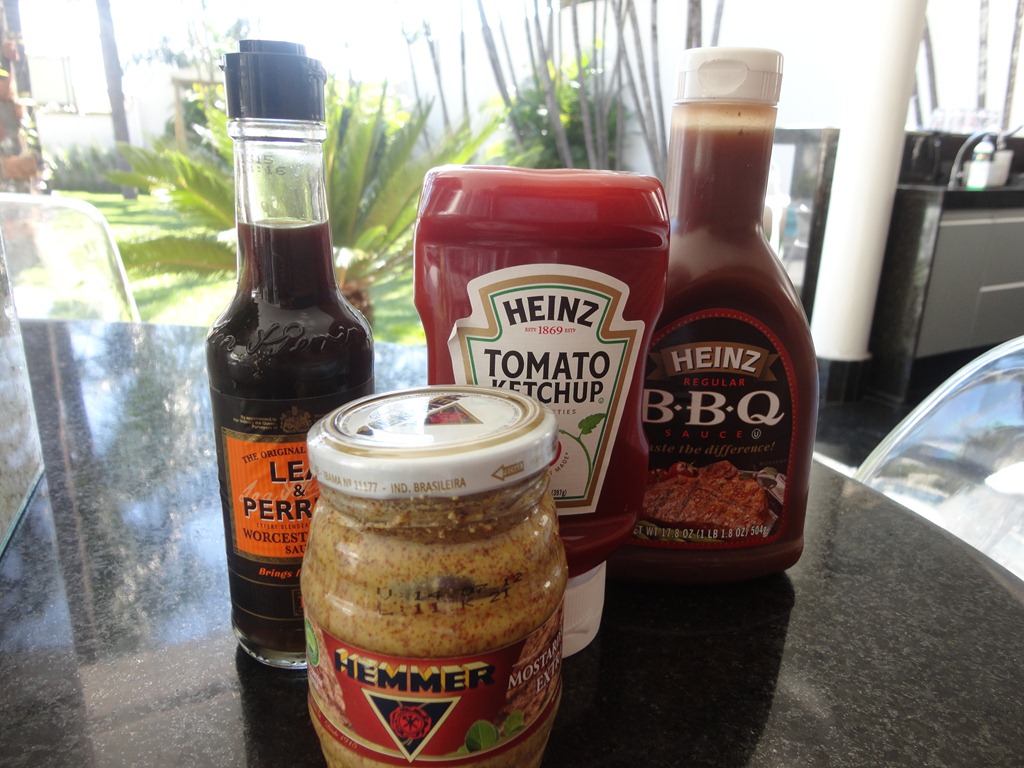 Os ingredientes e os molhos testados – ficou bom só com o molho inglês mesmo, e mostarda ! Os outros tiram o gosto de um verdadeiro sanduíche de bacon .