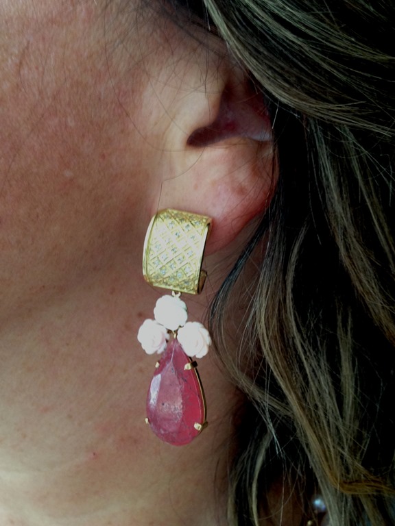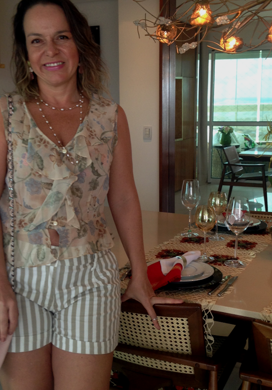 Tive o imenso prazer de ser convidada nessa 3a. para um almoço feminino no maior capricho. A gente se sente “ acariciada na alma quando é recebida com carinho, não é mesmo? Pensei em usar um floral “ desmaiado “ com complementos em cor-de-rosa, tudo muito feminino, como é a dona da casa.