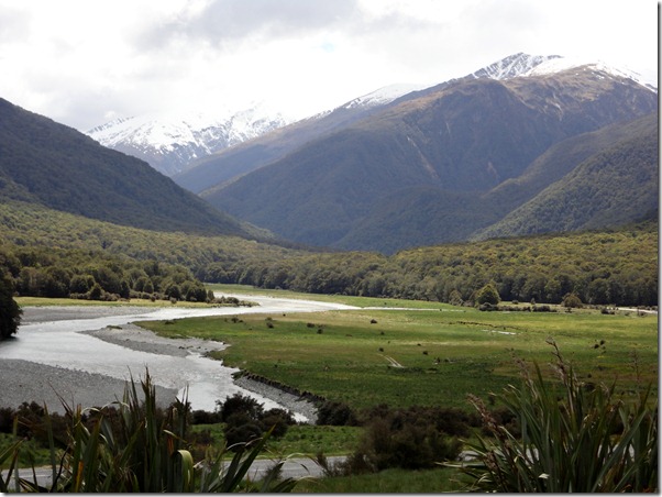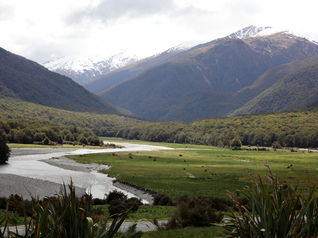 Os Alpes da Ilha Sul se estendem por mais de 540 km e terminam nos Fiords ( MILFORD SOUNDS), no Sul do país. O ponto mais alto é o Mount Cook (3754 metros ), além de mais de 20 picos acima dos 3 mil. As massas de terra continuam se chocando,adicionando altitude à cordilheira, e ocasionando pequenos terremotos. A cordilheira só é interrompida em 3 pontos mais baixos chamados Passes, nos quais foram construidas estradas e ferrovias, ligando um lado ao outro da ilha do Sul. Fora esses 3 pontos, não existe outra maneira de se passar de um lado ao outro, exceto voando ou escalando. Como aluguei um carro em GREYMOUTH , após descer do trem, seguimos por estradas lindas e cênicas.