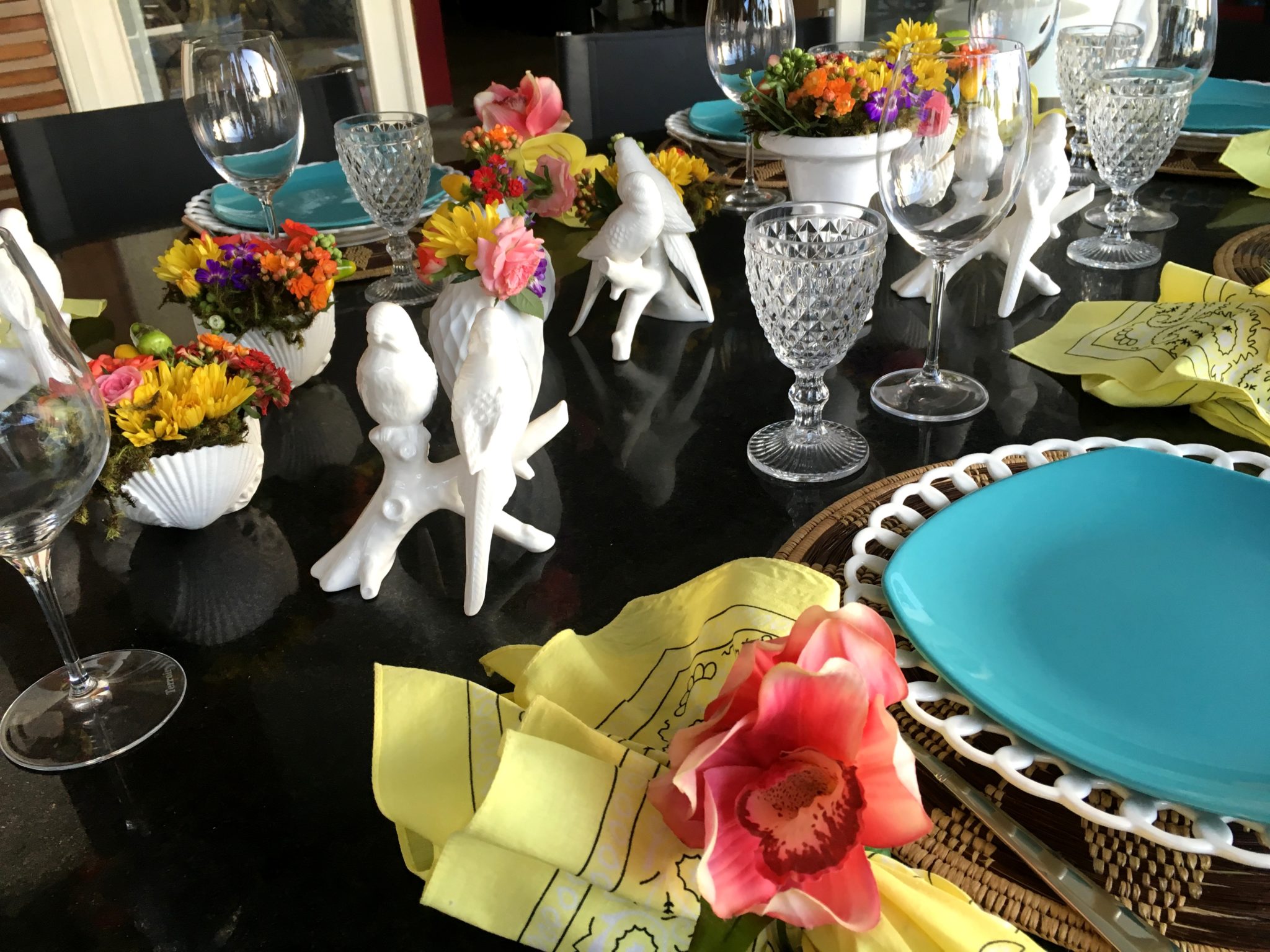 louça azul, jogos de fibra, guardanapo amarelo, porta-guardanapo rosa e vasos brancos com flores coloridas!