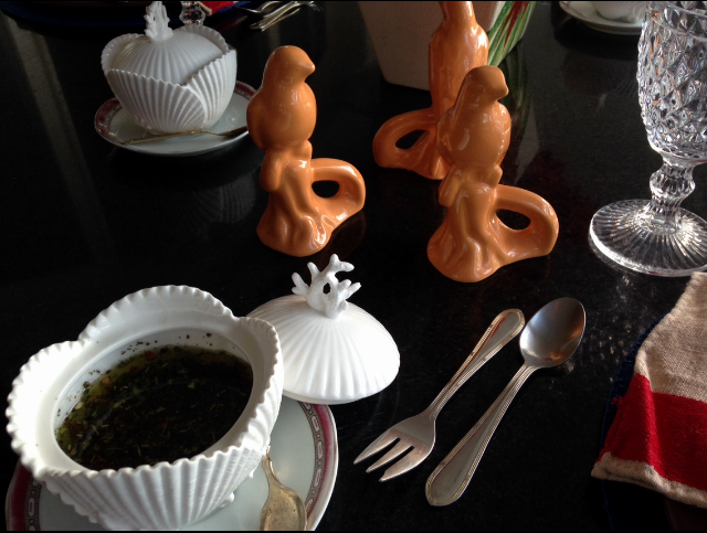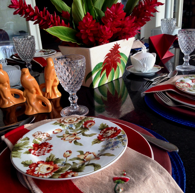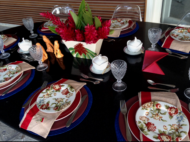 Mantive o azul no jogo americano e o vermelho nas louças VILLA VITTINI HOME – pássaros e vaso central CERAMICA LUIZ SALVADOR – escultura CÉSAR AUGUSTO FERREIRA – taças LA VILLE CASA – potinhos para Chimichurri ( os mesmos do SIG
