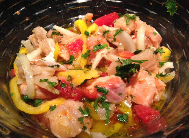 De entrada servi ceviche – prato super querido na América do Sul toda – com vinho branco uruguaio ALVARINHO , estão investindo muito nessa uva e estã dando certo!!