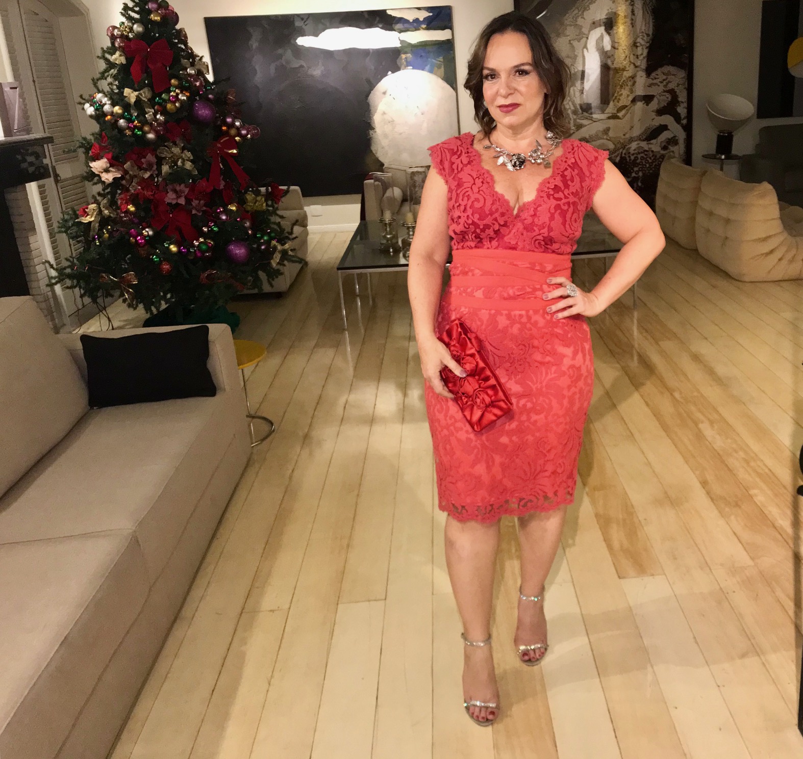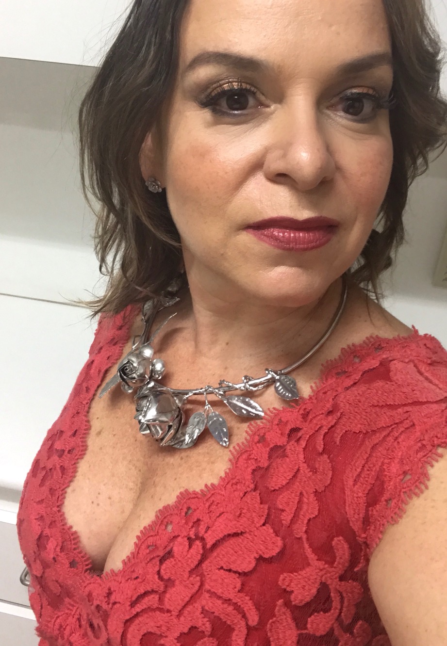 Afinal, para essa noite já em clima de Natal, eu escolhi usar vermelho . Além disso, usei joias em flores: colar, brinco e anel.