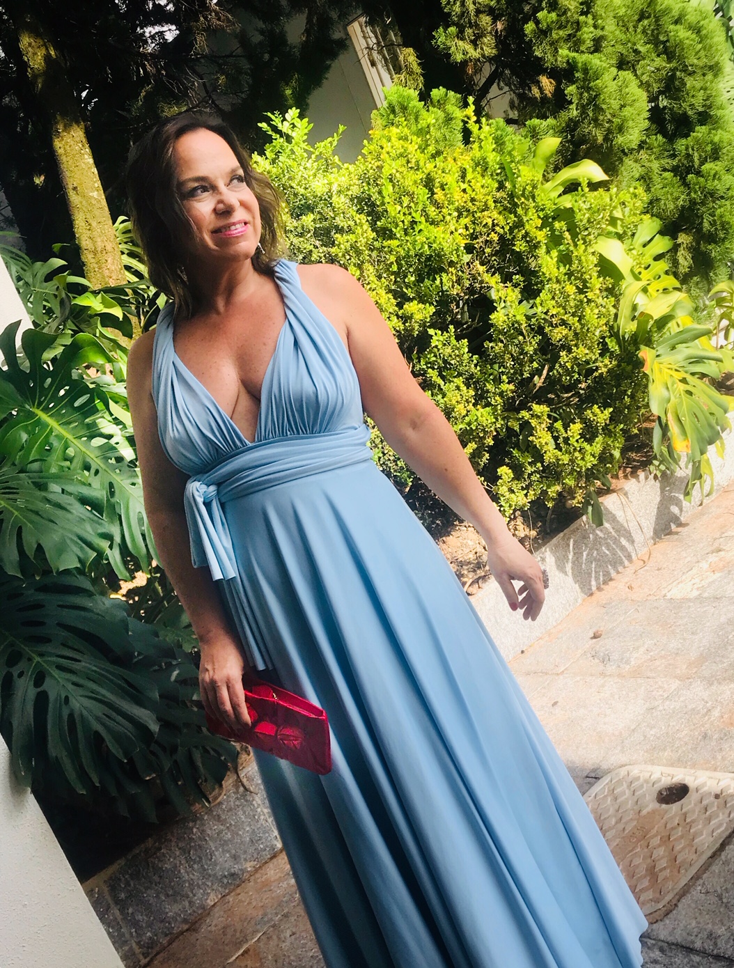 A outra turma – Celebs Girassóis – comemorou com uma sunset party em uma casa linda em Alphaville . Pelo horário do evento, escolhi usar cor pastel e um vestido bem fluido. Além disso, make azul para combinar.