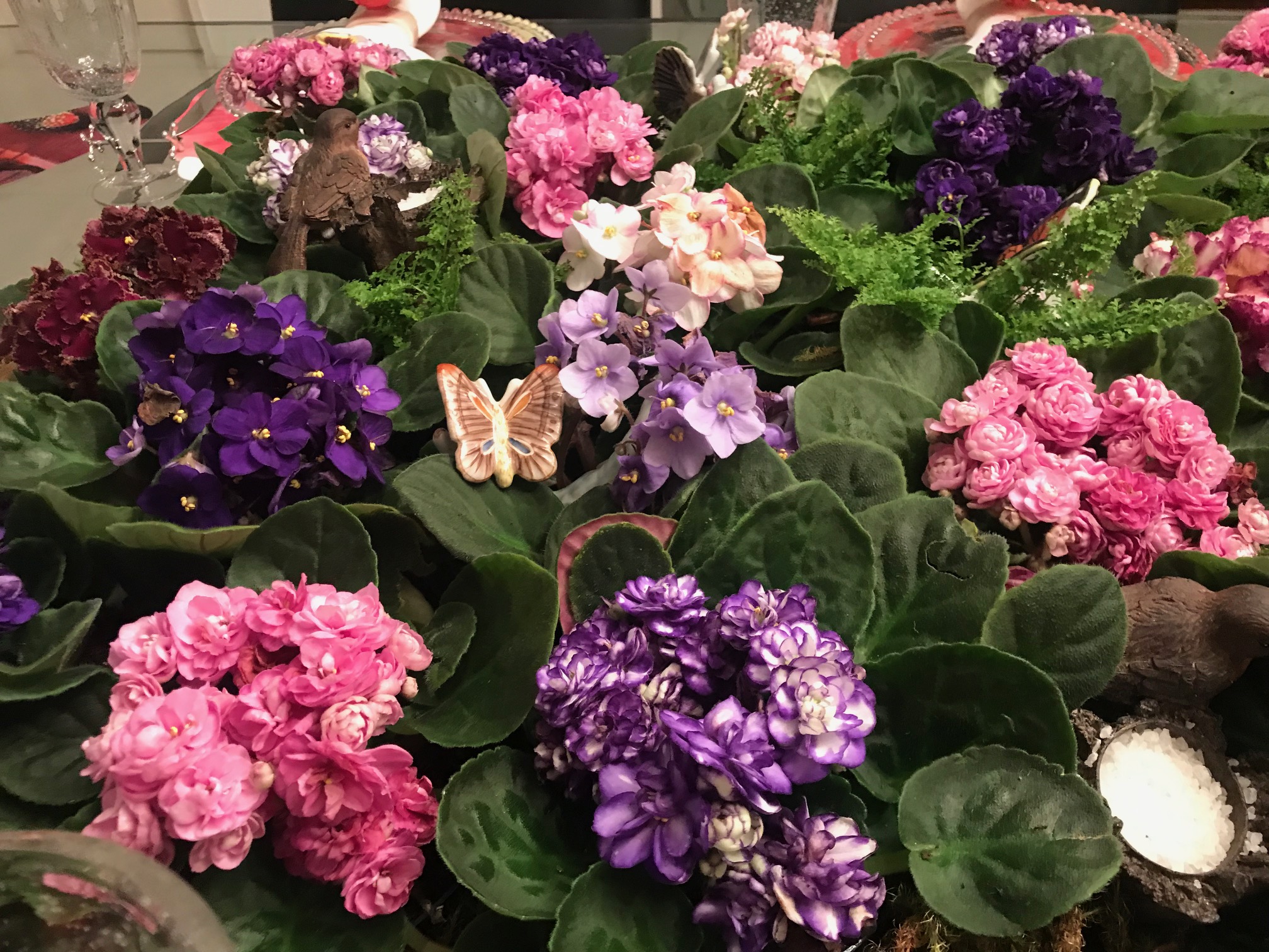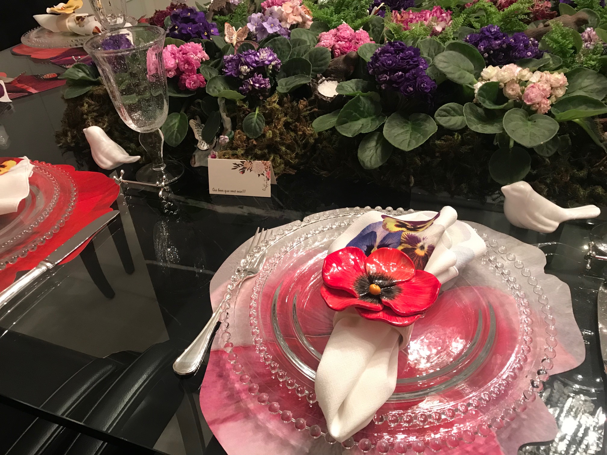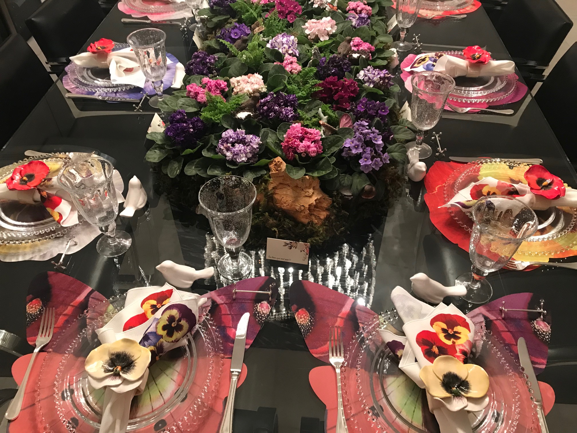 Andréa arrumou uma mesa maravilhosa usando os jogos e porta-guardanapos de amor-perfeito da @MAPERLE_TABLECOUTURE . Não só ela montou um enorme e lindo jardim de violetas, como também deixou pousar pássaros e borboletas.