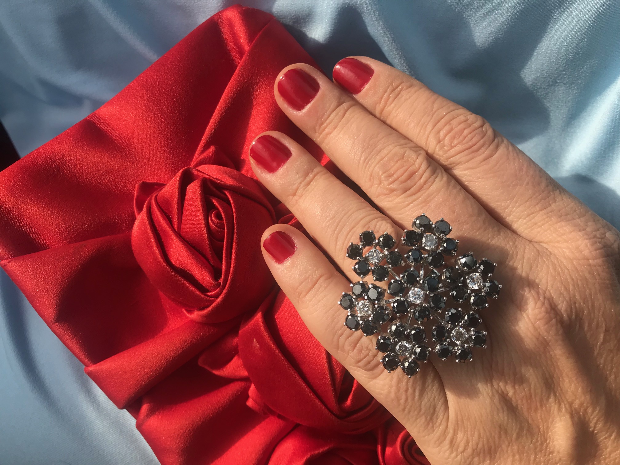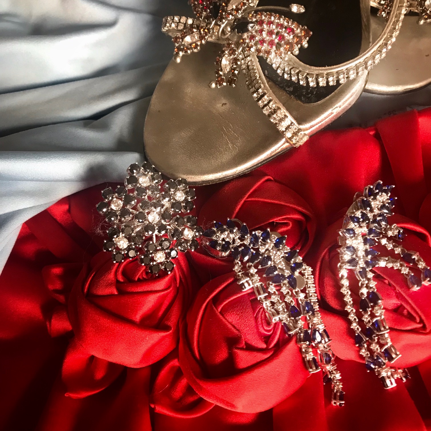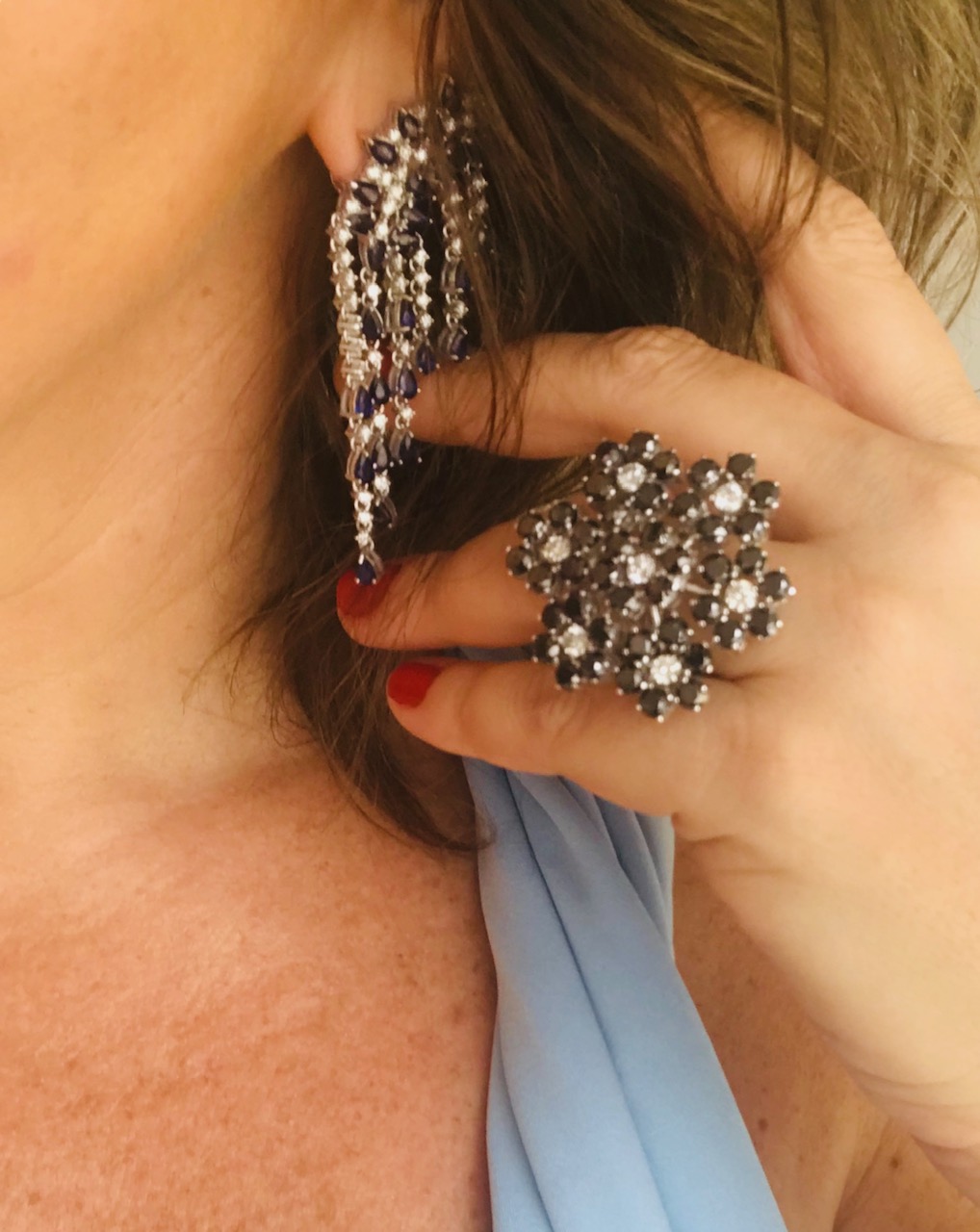 A flor do anel conversava com as flores da clutch e os brilhantes davam todo o glamour final.