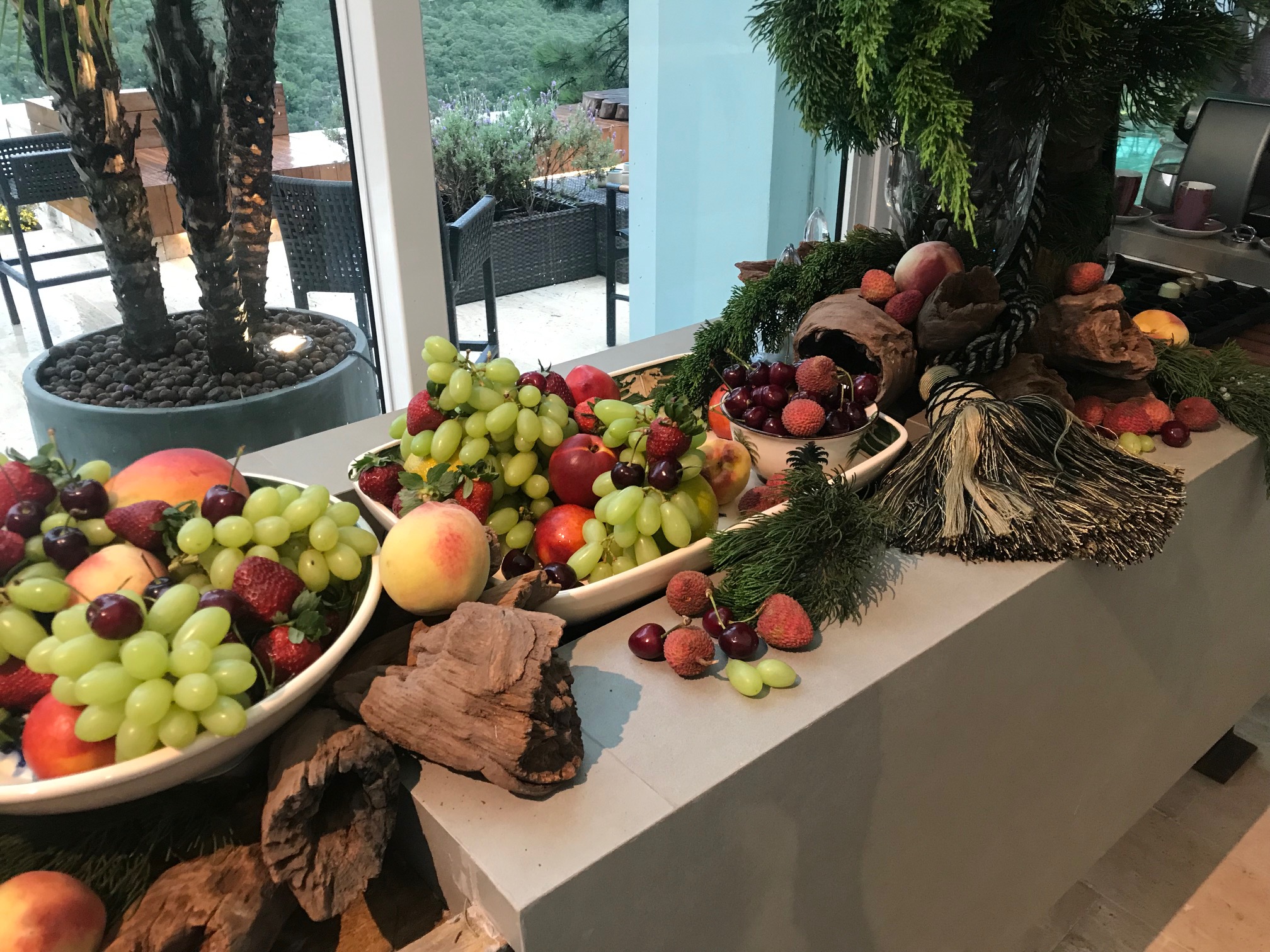 A primeira mesa estava montada em tons vermelhos, mas sempre mantendo esses elementos naturais. Na sequência, um arranjo de frutas deslumbrante acolhia quem ia chegando.